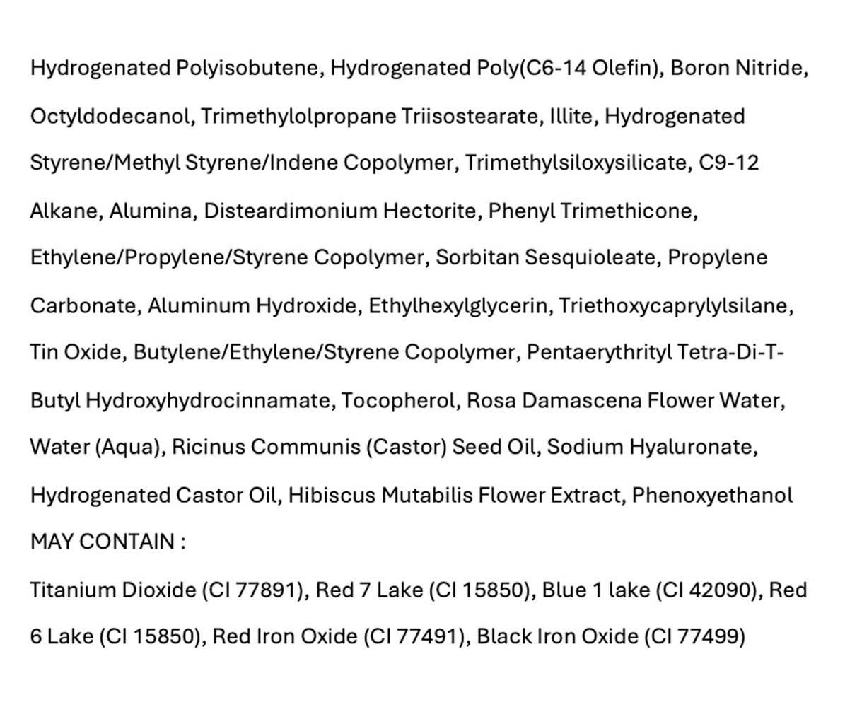 Ingredients: Hydrogenated Polyisobutene, Hydrogenated Poly (C6-14 Olefin), Boron Nitride, Octyldodecanol, Trimethylolpropane Triisostearate, Illite, Hydrogenated Styrene/Methyl Styrene/Indene Copolymer, Trimethylsiloxysilicate, C9-12 Alkane, Alumina, Disteardimonium Hectorite, Phenyl Trimethicone, Ethylene/Propylene/Styrene Copolymer, Sorbitan Sesquioleate, Propylene Carbonate, Aluminum Hydroxide, Ethylhexylglycerin, Triethoxycaprylylsilane, Tin Oxide, Butylene/Ethylene/Styrene Copolymer, Pentaerythrityl Tetra-Di-T-Butyl Hydroxyhydrocinnamate, Tocopherol, Rosa Damascena Flower Water, Water (Aqua), Ricinus Communis (Castor) Seed Oil, Sodium Hyaluronate, Hydrogenated Castor Oil, Hibiscus Mutabilis Flower Extract, Phenoxyethanol [+/-]: Titanium Dioxide (CI 77891), Red 7 Lake (CI 15850), Blue 1 Lake (CI 42090), Red 6 Lake (CI 15850), Red Iron Oxide (CI 77491), Black Iron Oxide (CI 77499)