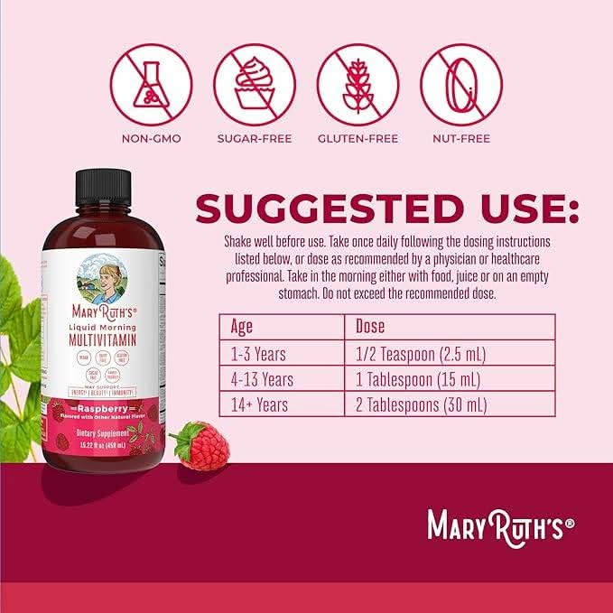 MaryRuth's Liquid Morning Vegan Multivitamin Diatary Supplements, Raspberry (15.22 fl oz)