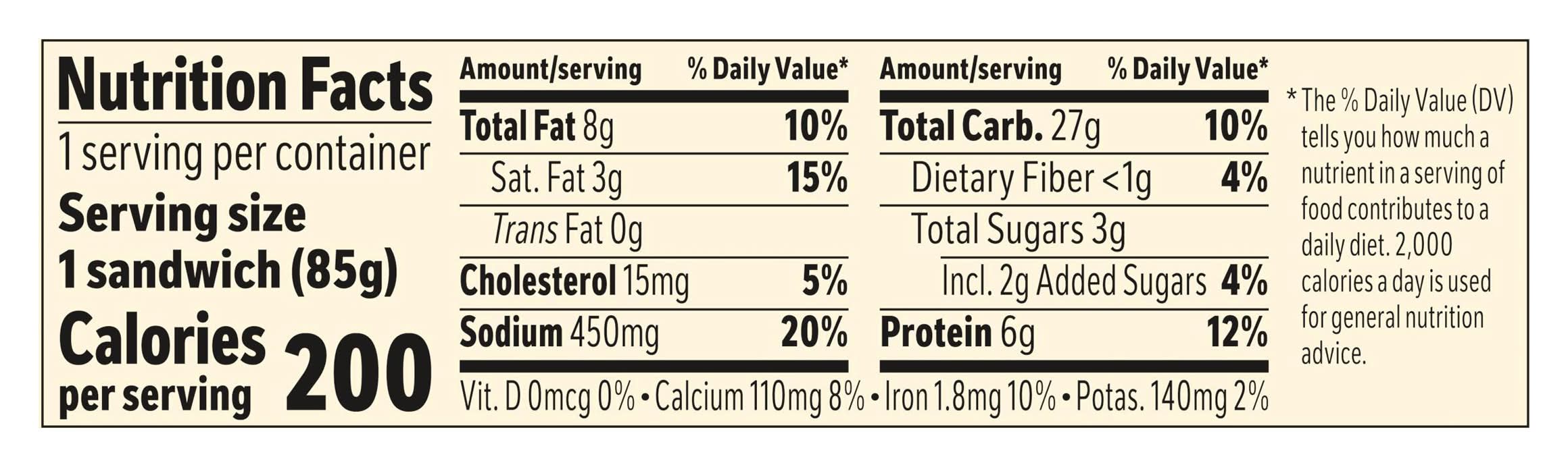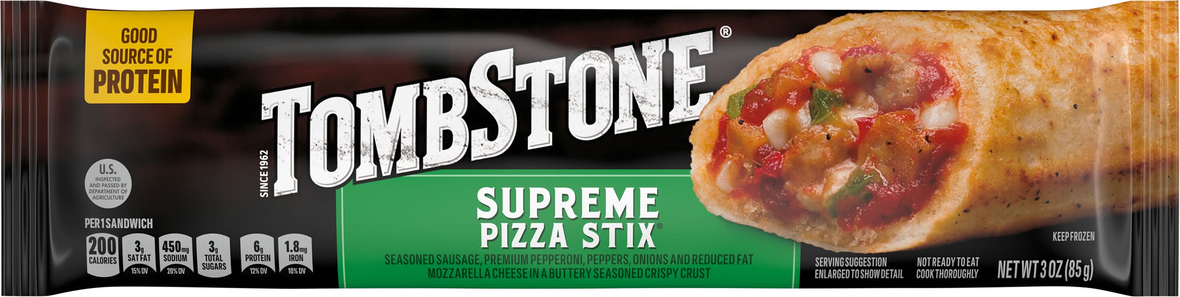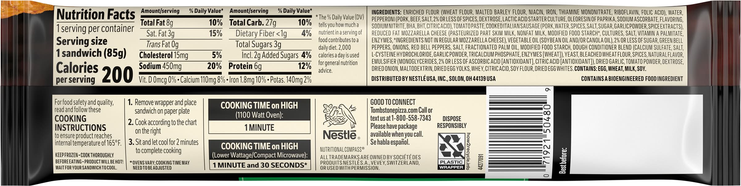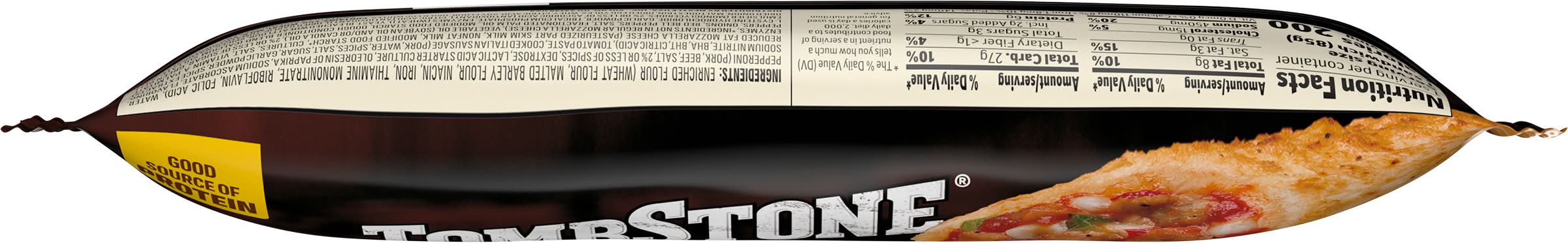 Seasoned sausage, premium pepperoni, peppers, onions and reduced fat mozzarella cheese in a buttery seasoned crispy crust. Per 1 Sandwich: 200 calories; 3 g sat fat (15% DV); 450 mg sodium (20% DV); 3 g total sugars; 6 g protein (12% DV); 1.8 mg iron (10% DV). Good source of protein. Nutritional Compass: Nestle - Good to Connect: Tombstonepizza.com. Call or text us at 1-800-558-7343. Please have package available when you call. Since 1962. Not ready to eat. U.S. inspected and passed by Department of Agriculture. Tombstonepizza.com. how2recycle.info. Dispose responsibly. Size: 3 OZ