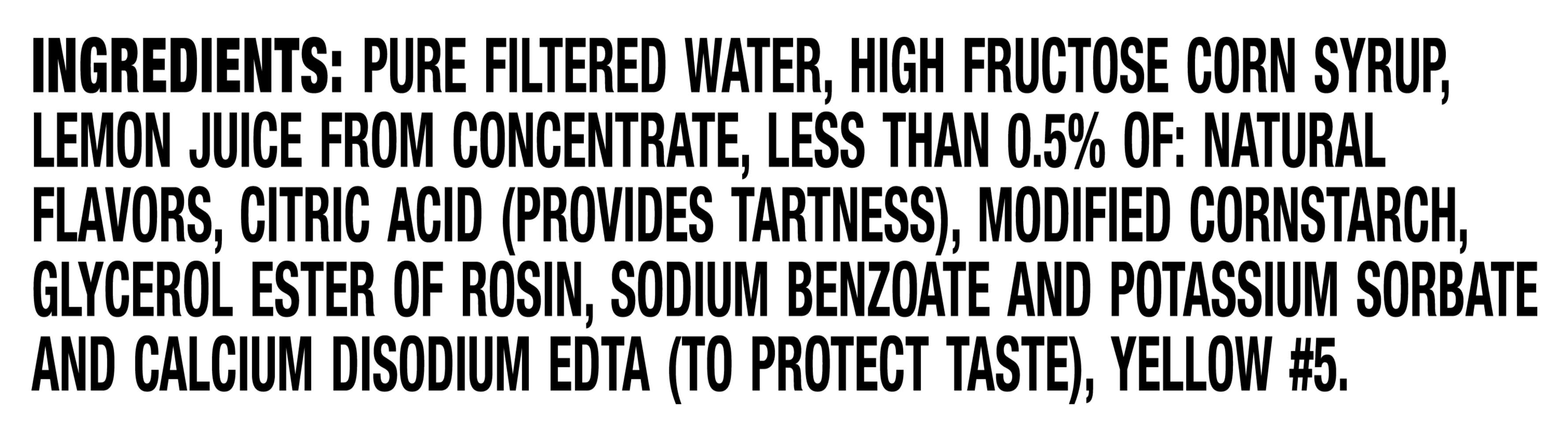 Ingredients: Contains Pure Filtered Water, High Fructose Corn Syrup, Lemon Juice From Concentrate, Less Than 0.5% Of: Natural Flavors, Citric Acid (Provides Tartness), Modified Cornstarch, Glycerol Ester Of Rosin, Sodium Benzoate And Potassium Sorbate And Calcium Disodium Edta (To Protect Taste), Yellow #5.