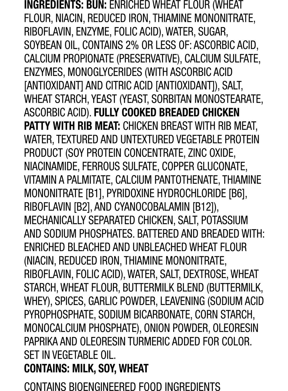 Ingredients: BUN: Enriched wheat flour (wheat flour, niacin, reduced iron, thiamine mononitrate, riboflavin, enzyme, folic acid), water, sugar, soybean oil, contains 2% or less of: ascorbic acid, calcium propionate (preservative), calcium sulfate, enzymes, monoglycerides (with ascorbic acid [antioxidant] and citric acid [antioxidant]), salt, wheat starch, yeast (yeast, sorbitan monostearate, ascorbic acid). FULLY COOKED BREADED CHICKEN PATTY WITH RIB MEAT: Chicken breast with rib meat, water, textured and untextured vegetable protein product (soy protein concentrate, zinc oxide, niacinamide, ferrous sulfate, copper gluconate, vitamin a palmitate, calcium pantothenate, thiamine mononitrate [b1], pyridoxine hydrochloride [b6], riboflavin [b2], and cyanocobalamin [b12]), mechanically separated chicken, salt, potassium and sodium phosphates. battered and breaded with: enriched bleached and unbleached wheat flour (niacin, reduced iron, thiamine mononitrate, riboflavin, folic acid), water, salt, dextrose, wheat starch, wheat flour, buttermilk blend (buttermilk, whey), spices, garlic powder, leavening (sodium acid pyrophosphate, sodium bicarbonate, corn starch, monocalcium phosphate), onion powder, oleoresin paprika and oleoresin turmeric added for color. set in vegetable oil. Contains: Milk, Soy, Wheat
