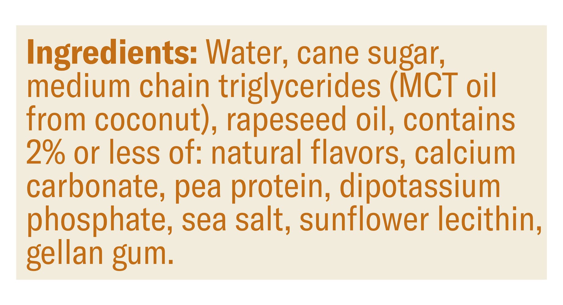 Water, Cane Sugar, Medium Chain Triglycerides (Mct Oil from Coconut), Rapeseed Oil, Contains 2% or Less of: Natural Flavors, Calcium Carbonate, Pea Protein, Dipotassium Phosphate, Sea Salt, Sunflower Lecithin, Gellan Gum Contains: Tree Nuts, Coconuts