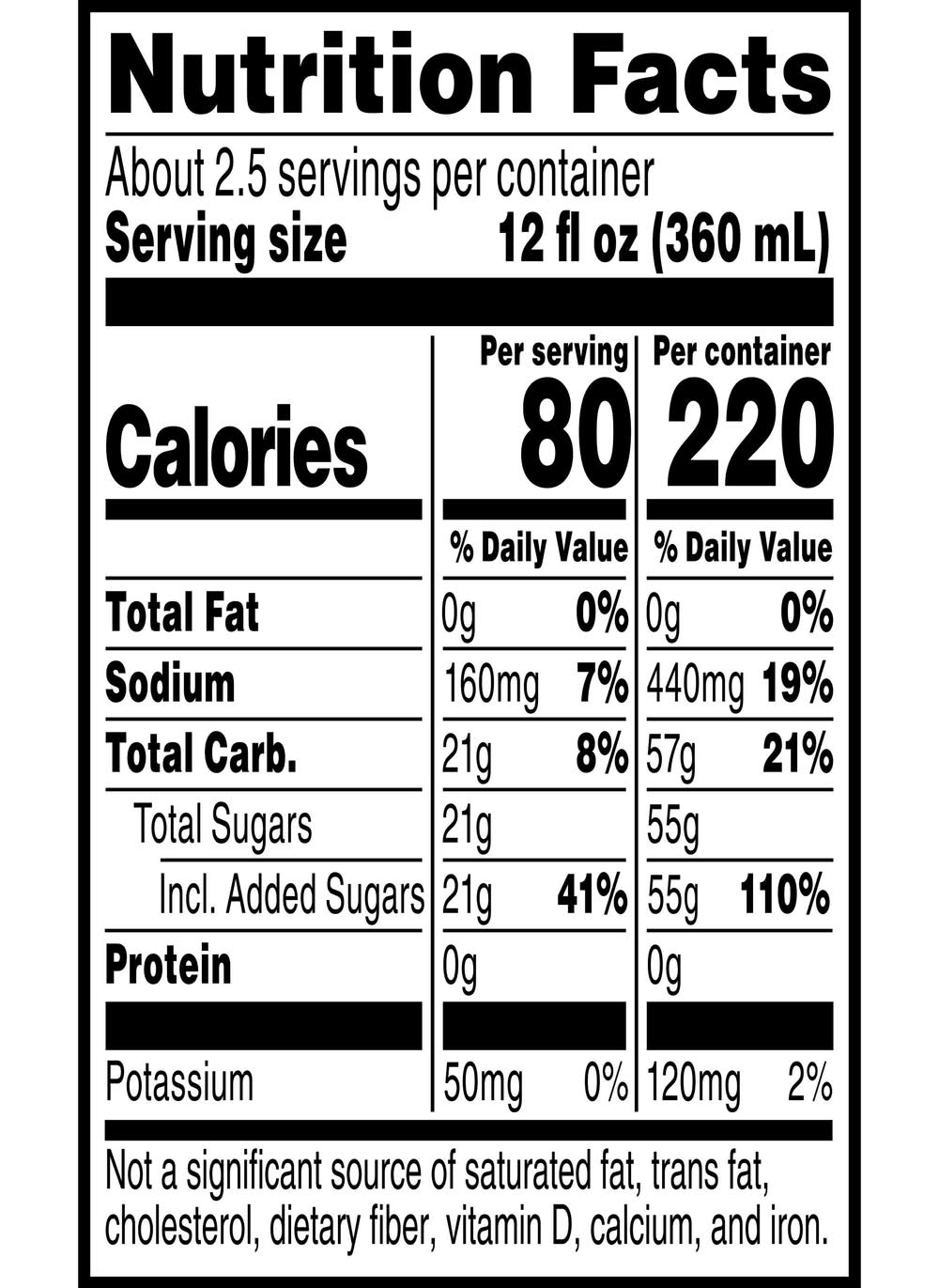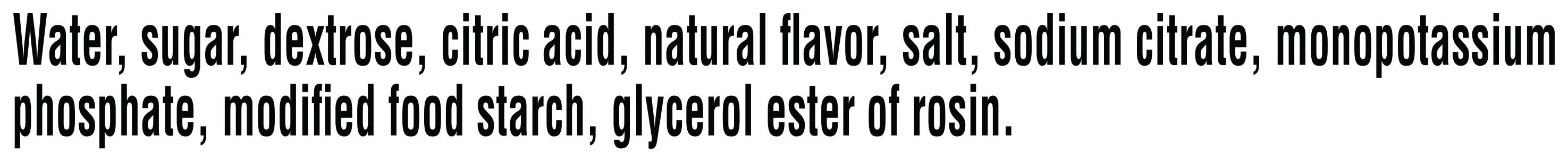 Ingredients: Water, Sugar, Dextrose, Citric Acid, Natural Flavor, Sodium Citrate, Salt, Monopotassium Phosphate, Modified Food Starch, Glycerol Ester Of Rosin