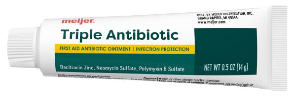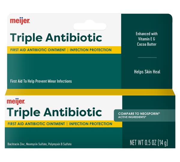 Meijer First Aid Triple Antibiotic Ointment, Treats Minor Cuts, Scrapes, and Burns (0.5 oz) is designed to provide infection protection for minor skin injuries. Suitable for burns as well as cuts and scrapes, this ointment promotes healthy-looking skin by aiding the healing process. Its formula contains bacitracin zinc, neomycin sulfate, and polymyxin B sulfate, which are known for their efficacy in treating such conditions.