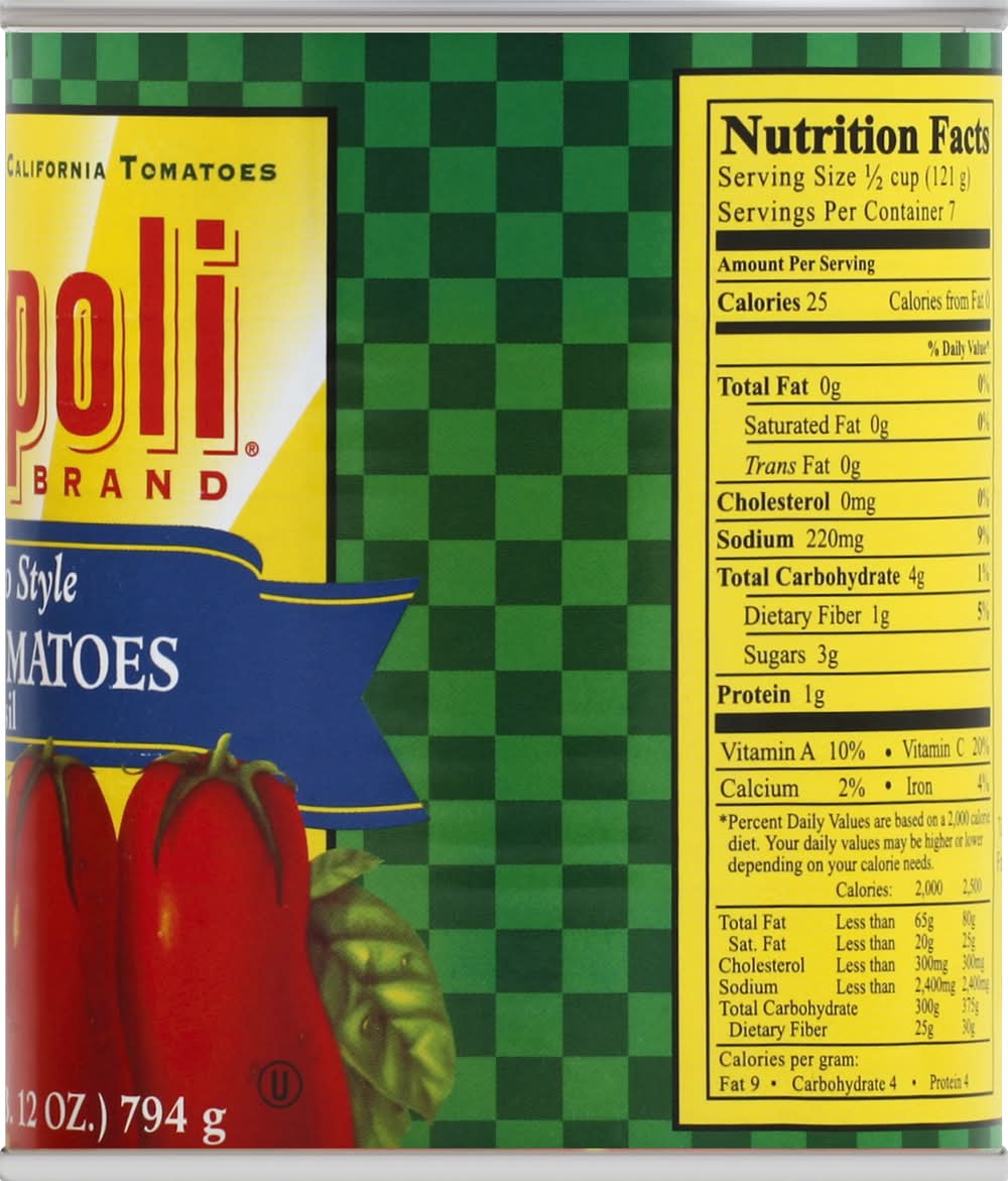 Tomatoes with Added Tomato Juice, Salt, Firming Agents (Calcium Chloride and/or Calcium Sulfate), Citric Acid, Basil
