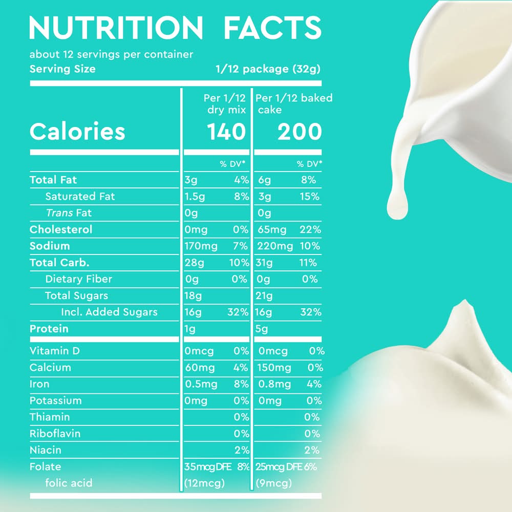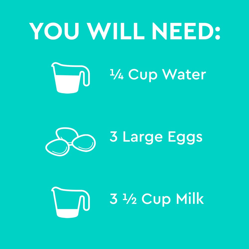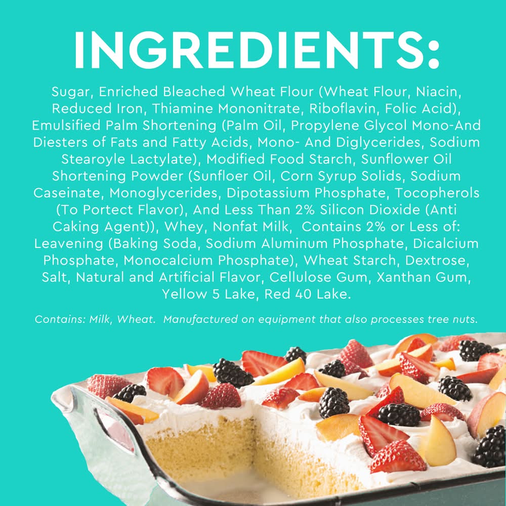 You Will Need: For the cake, 1-2 cup water, 3 large eggs, for the milk syrup, 3 - 1/2 cups milk. Baking Instructions: Step 1. Prep: Preheat oven to 350 degrees F for metal and glass pan. 325 degrees F for dark or coated pan(s) (Add 3-5 minutes to bake time for dark or coated pan). Grease sides and bottom of 13 x 9 inch pan and flour lightly. Step 2. Mix: Blend cake mix, water, and eggs in a large bowl at low speed until moistened (about 30 seconds). Beat at medium speed for 1 minutes. Pour batter in to prepared cake pan. Step 3. Bake: for 18-20 minutes. Add 3-5 minutes to bake time for dark or coated pan. Cake is done when toothpick inserted in center comes out clean. Cook in pan on wire rack for 10 minutes. Poke holes is cake with fork, 1/2-inch apart. Leave cake in the pan. Step 4. Blend: Blend contents from small packet and 3 -1/2 cups milk in small bowl with wire whisk until completely dissolved and well blended. Step 5. Pour: Pour milk syrup over top of cake in pan slowly. Cover and refrigerate at least 2 hours. Frost before serving. Keep refrigerated until ready to serve. Promptly refrigerate unused baked cake. High altitude (over 3.500 FT): Heat oven to 350 degrees F. Stir in 1/4 cup flour into mix. Mix as directed above. Bake at 350 degrees F 13 x 9-inch pan 18-20 min.