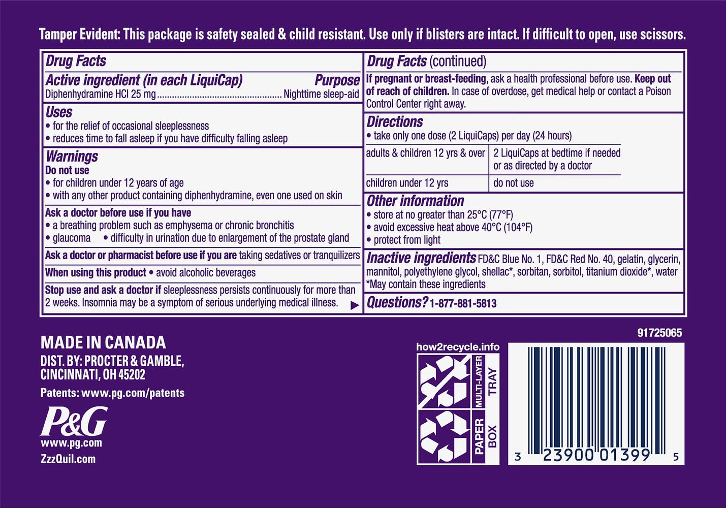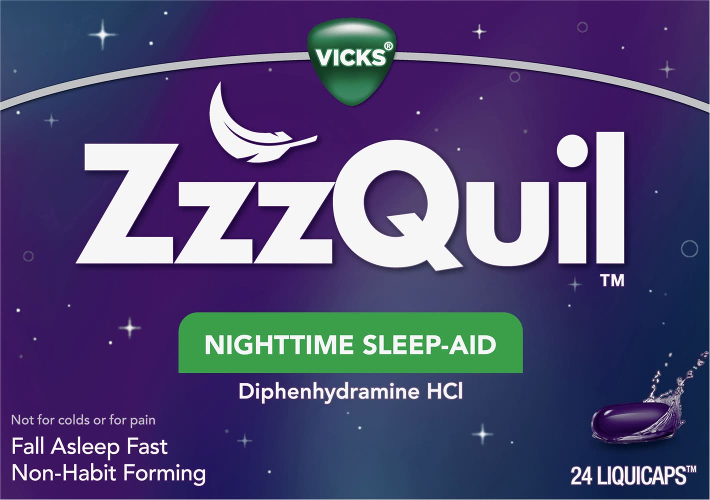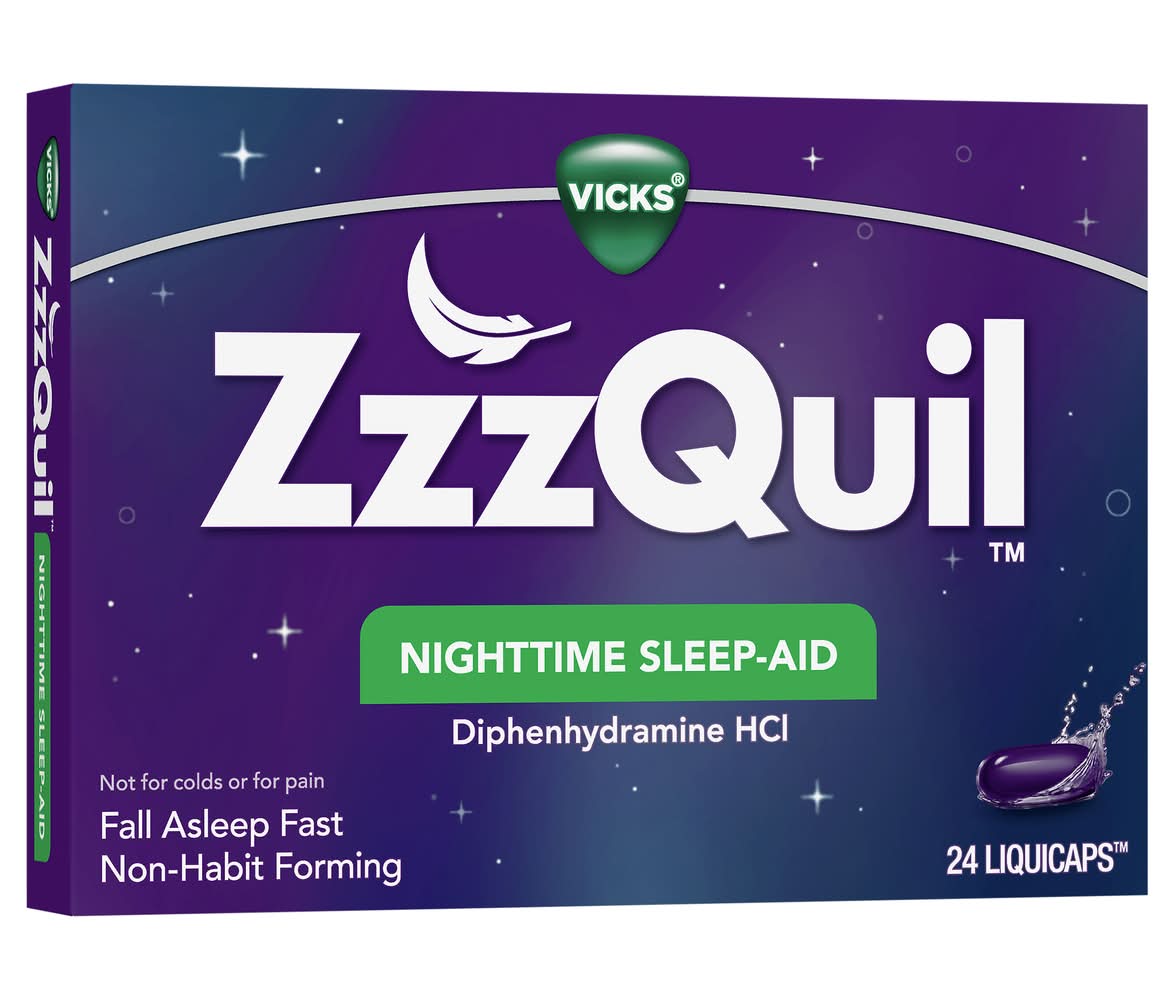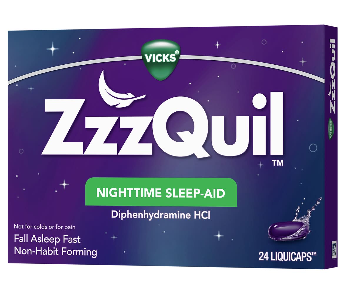 Everyone deserves a good night's sleep. When you're having trouble getting the rest you need, but don't want to take prescription sleeping pills, try Zzzquil LiquiCaps. This non-habit-forming sleep-aid helps you get some shut-eye, so you can wake up feeling refreshed and ready to take on your day. • Size: 24 CT • Procter & Gamble, Cincinnati,OH,45202,877-881-5813 • Packaging: Reusable