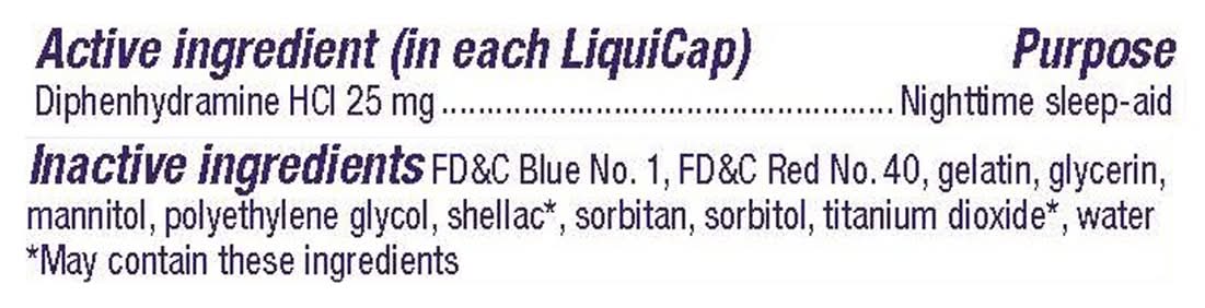 Ingredients: In Each LiquiCap Active Ingredients: Diphenhydramine HCI (25 mg), Nighttine Sleep-Aid. Inactive Ingredients: FD&C Blue 1, FD&C Red 40, Gelatin, Glycerin, Mannitol, Polyethylene Glycol, Shellac (May Contain These Ingredients), Sorbitan, Sorbitol, Titanium Dioxide (May Contain These Ingredients), Water