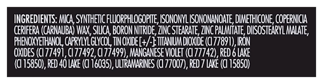 Ingredients: Mica, Synthetic Fluorphlogopite, Isononyl Isononanoate, Dimethicone, Copernicia Cerifera (Carnauba) Wax, Silica, Boron Nitride, Zinc Stearate, Zinc Palmitate, Diisostearyl Malate, Phenoxyethanol, Caprylyl Glycol, Tin Oxide [+/-]: Titanium Dioxide (CI 77891), Iron Oxides (CI 77491, CI 77492, CI 77499), Manganese Violet (CI 77742), Red 6 Lake (CI 15850), Red 40 Lake (CI 16035), Ultramarines (CI 77007), Red 7 Lake (CI 15850)