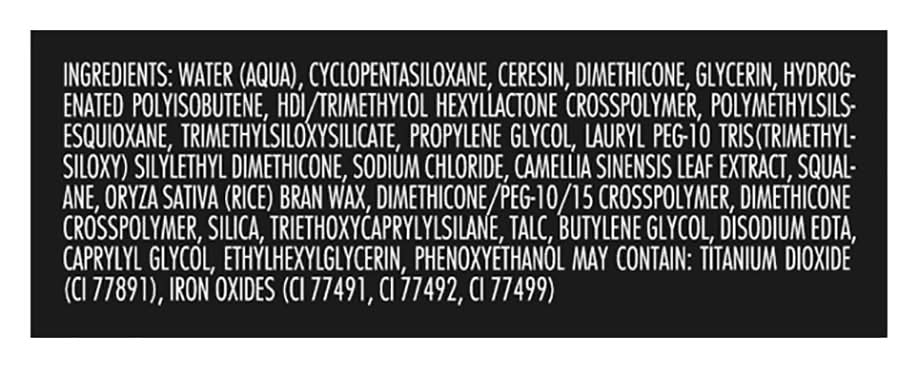 Ingredients: Water (Aqua), Cyclopentasiloxane, Ceresin, Dimethicone, Glycerin, Hydrogenated Polyisobutene, HDI/Trimethylol Hexyllactone Crosspolymer, Polymethylsilsesquioxane, Trimethylsiloxysilicate, Propylene Glycol, Lauryl PEG-10 Tris(Trimethylsiloxy) Silylethyl Dimethicone, Sodium Chloride, Camellia Sinensis Leaf Extract, Squalane, Oryza Sativa (Rice) Bran Wax, Dimethicone/PEG-10/15 Crosspolymer, Dimethicone Crosspolymer, Silica, Triethoxycaprylylsilane, Talc, Butylene Glycol, Disodium EDTA, Caprylyl Glycol, Ethylhexylglycerin, Phenoxyethanol May Contain: Titanium Dioxide (CI 77891), Iron Oxides (CI 77491, CI 77492, CI 77499)