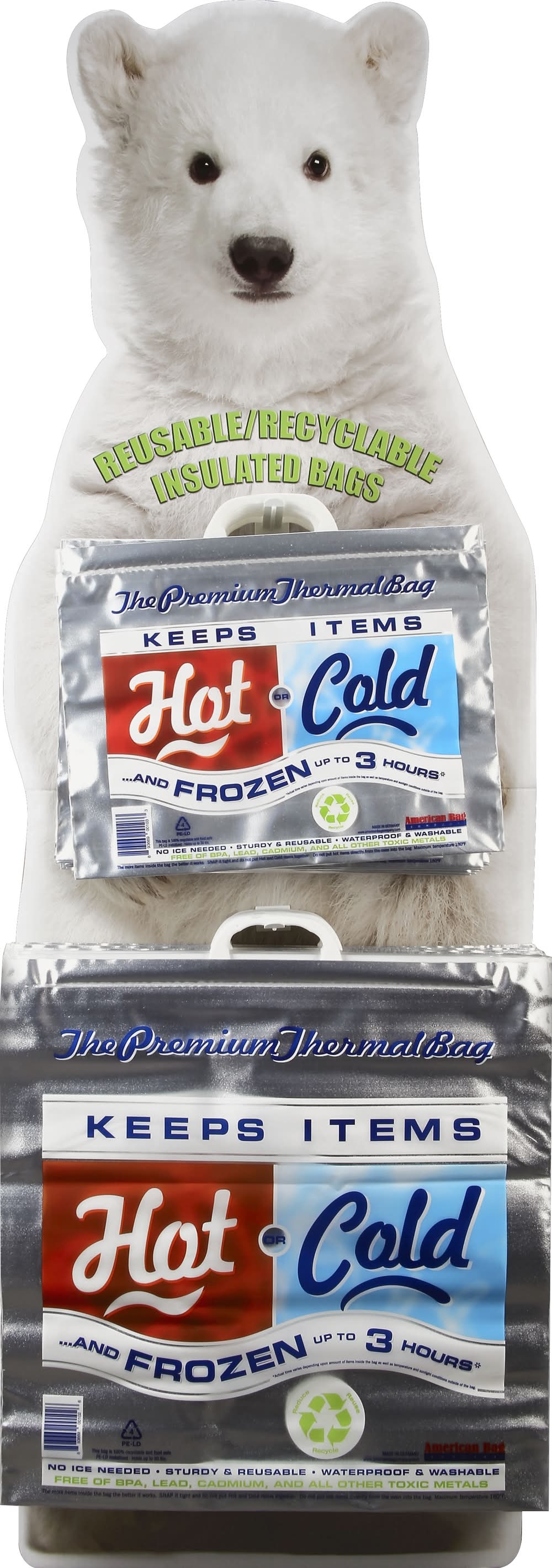 Thermal Bag, Premium, Hot or Cold These are the bags that created the generic trademark "Hot or Cold bags." They are 100% recyclable, food safe, and reusable, and offer a convenient way of keeping items hot or cold and frozen for hours at a time. Since they are so light weight and fold completely flat you can practically take them anywhere, or keep a few of them in the trunk of your car so you are always prepared. They are great for any activity including grocery shopping, the beach, boating, fishing, sporting events, lunches, picnics, travel, etc. Don't waste your energy carrying around a bulky cooler. Less is more! • American Bag, • Packaging: Reusable