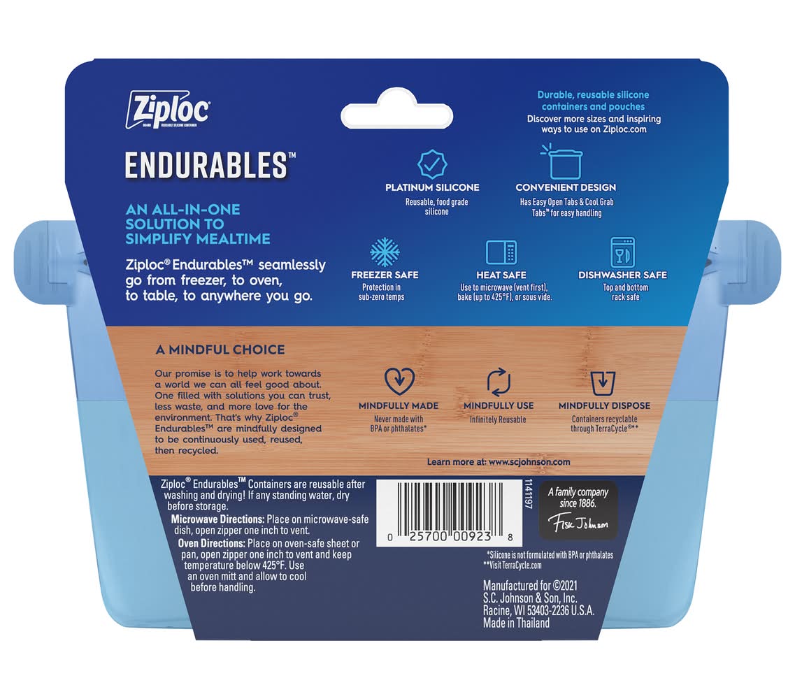 Usage of instructions:Ziploc Endurables Containers are reusable after washing and drying! If any standing water, dry before storage. - Directions: Ziploc Endurables Containers are reusable after washing and drying! If any standing water, dry before storage. Microwave Directions: Place on microwave-safe dish, open zipper one inch to vent. Oven Directions: Place on oven-safe sheet or pan, open zipper one inch to vent and keep temperature below 425 degrees F. Use an oven mitt and allow to cool before handling.