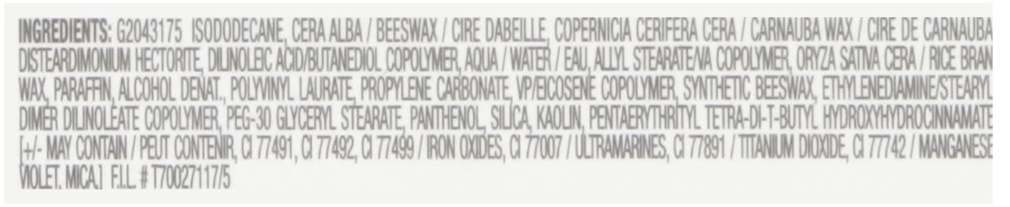 Ingredients: G2043175 Isododecane, Cera Alba/Beeswax/Cire Dabeille, Copernicia Cerifera Cera/Carnauba Wax/Cire De Carnauba, Disteardimonium Hectorite, Dilinoleic Acid/Butanediol Copolymer, Aqua/Water/Eau, Allyl Stearate/VA Copolymer, Oryza Sativa Cera/Rice Bran Wax, Paraffin, Alcohol Denat, Polyvinyl Laurate, Propylene Carbonate, VP/Eicosene Copolymer, Synthetic Beeswax, Ethylenediamine/Stearyl Dimer Dilinoleate Copolymer, PEG-30 Glyceryl Stearate, Panthenol, Silica, Kaolin, Pentaerythrityl Teta-Di-T-Butyl Hydroxyhydrocinnamate, [+/- May Contain/Peut Contenir, CI 77491, CI 77492, CI 77499/Iron Oxides, CI 77007/Ultramarines, CI 77891/Titanium Dioxide, CI 77742/Manganese Violet, Mica] F.I.L. # T70027117/5