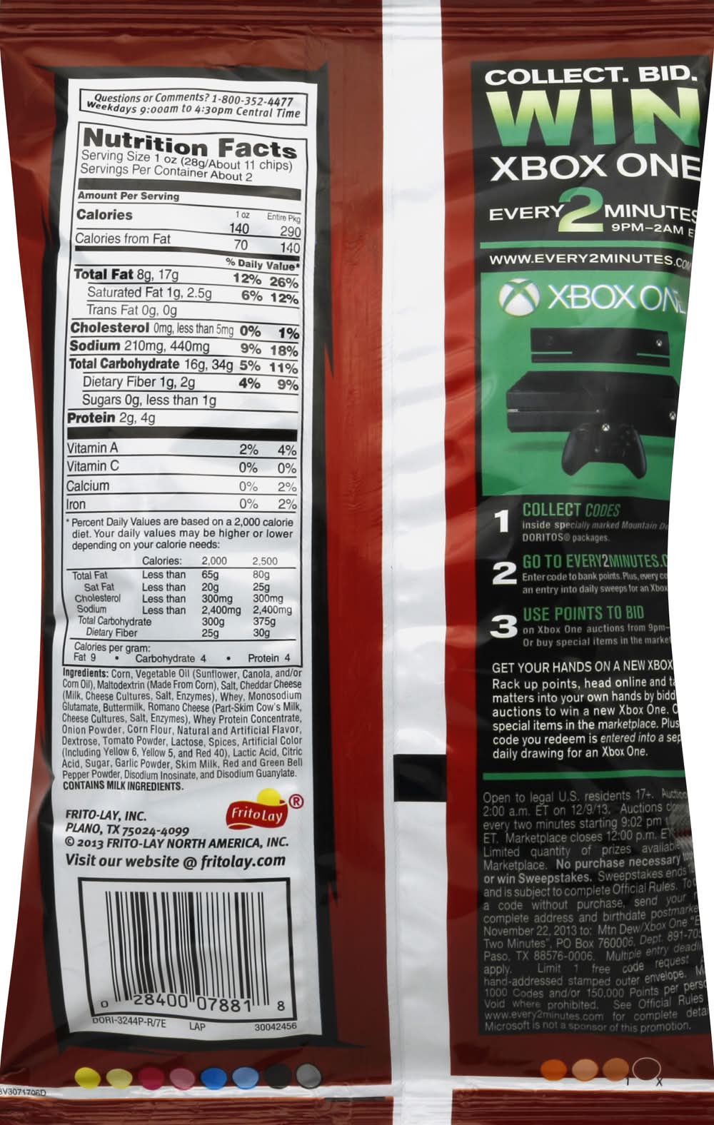 Ingredients: Corn, Vegetable Oil (Sunflower, Canola, And/Or Corn Oil), Maltodextrin (Made From Corn), And Less Than 2% Of Salt, Whey, Cheddar Cheese (Milk, Cheese Cultures, Salt, Enzymes), Buttermilk, Monosodium Glutamate, Romano Cheese (Cow'S Milk, Cheese Cultures, Salt, Enzymes), Onion Powder, Corn Flour, Natural And Artificial Flavors, Dextrose, Tomato Powder, Whey Protein Concentrate, Spices, Lactose, Artificial Color (Yellow 6, Yellow 5, Yellow 6 Lake, Yellow 5 Lake, Red 40), Potassium Salt, Lactic Acid, Sodium Caseinate, Citric Acid, Sugar, Garlic Powder, Red And Green Bell Pepper Powder, Skim Milk, Disodium Inosinate, And Disodium Guanylate. Contains Milk Ingredients. Contains: Contains Milk Ingredients.