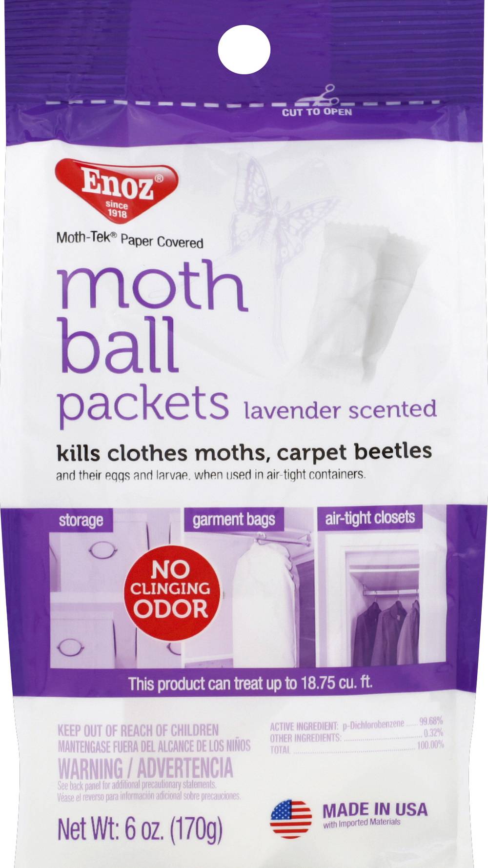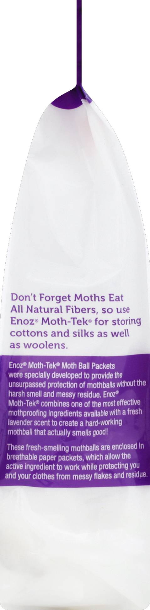 ENOZ Moth Ball Packets were specially developed to provide the unsurpassed protection of mothballs without the harsh smell and messy residue. ENOZ Moth Ball Packets combines 1 of the most effective mothproofing ingredients available with a fresh scent to create a hard-working mothball that actually smells good. These fresh-smelling mothballs are enclosed in breathable This product contains a chemical known to the State of California to cause cancer.https://www.p65warnings.ca.gov/chemicals/p-dichlorobenzene
