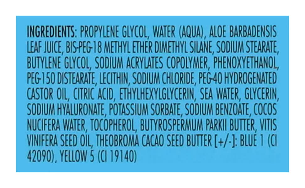 Ingredients: Propylene Glycol, Water (Aqua), Aloe Barbadensis Leaf Juice, Bis-PEG-18 Methyl Ether Dimethyl Silane, Sodium Stearate, Butylene Glycol, Sodium Acrylates Copolymer, Phenoxyethanol PEG-150 Distearate, Lecithin, Sodium Chloride, PEG-40 Hydrogenated Castor Oil, Citric Acid, Ethylhexylglycerin, Sea Water, Glycerin, Sodium Hyaluronate, Potassium Sorbate, Sodium Benzoate, Cocos Nucifera Water, Tocopherol, Butyrospermum Parkii Butter, Vitis Vinifera Seed Oil, Theobroma Cacao Seed Butter [+/-]: Blue 1 (CI 42090), Yellow 5 (CI 19140)