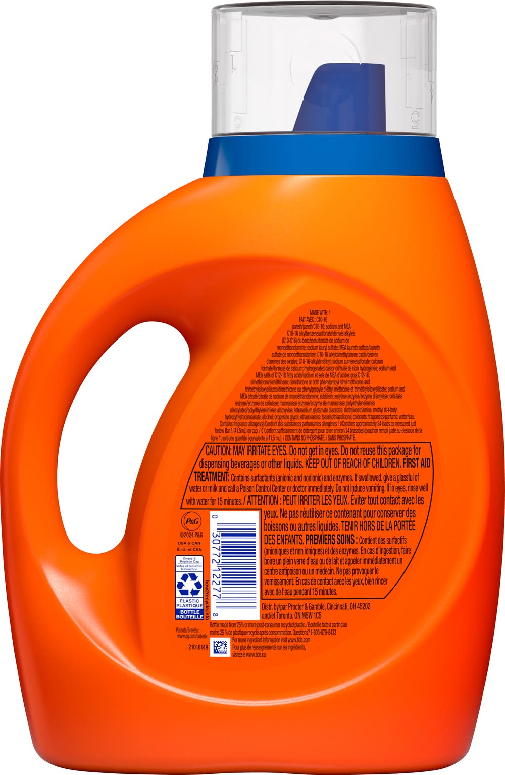Ingredients: C10-16 Pareth; Sodium and MEA C10-16 Alkylbenzenesulfonate; Sodium Lauryl Sulfate; MEA Laureth Sulfate; C10-16 Alkyldimethylamine Oxide, C10-16-Alkyldimethyl; Sodium Cumenesulfonate; Calcium Formate, Hydrogenated Castor Oil; Sodium and MEA Salts of C12-18 Fatty Acids; Simethicone, Dimethicone or Both Phenylpropyl Ethyl Methicone and Trimethylsiloxysilicate; Sodium and MEA Citrate; Subtilisin, Amylase Enzyme; Cellulase Enzyme; Mannanase Enzyme; Polyethyleneimines Alkoxylated; Tetrasodium Glutamate Diacetate; Diethylenetriamine; Methyl Di-T-Butyl Hydroxyhydrocinnamate; Alcohol; Propylene Glycol; Ethanolamine; Benzisothiazolinone; Colorants; Fragrances, Water