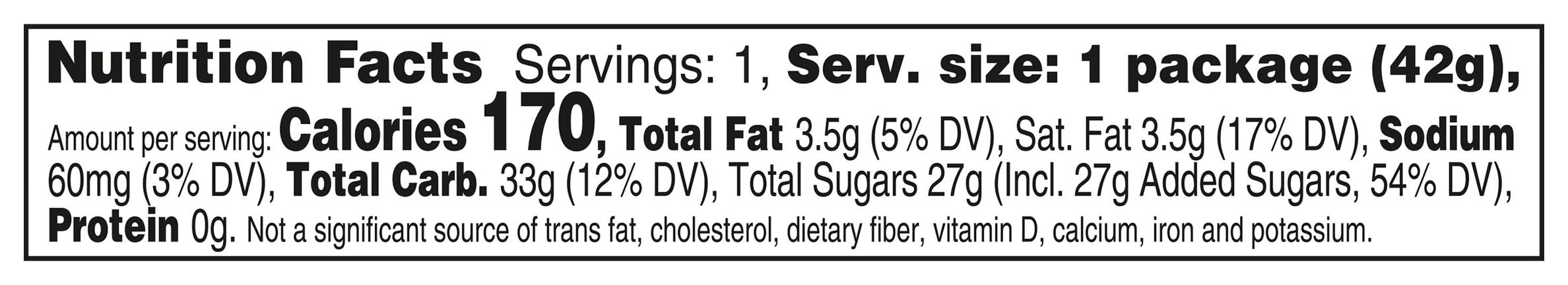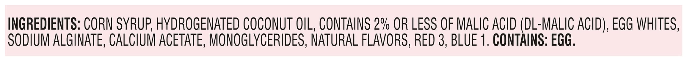 Ingredients: CORN SYRUP, HYDROGENATED COCONUT OIL, AND LESS THAN 2% OF MALIC ACID, EGG ALBUMEN, SODIUM ALGINATE, CALCIUM ACETATE, MONOGLYCERIDES, NATURAL FLAVOR, BLUE 1, RED 3. Contains: This product was manufactured in a facility where milk, eggs, almonds, coconut, peanuts and soy are\nused in the production of other products.