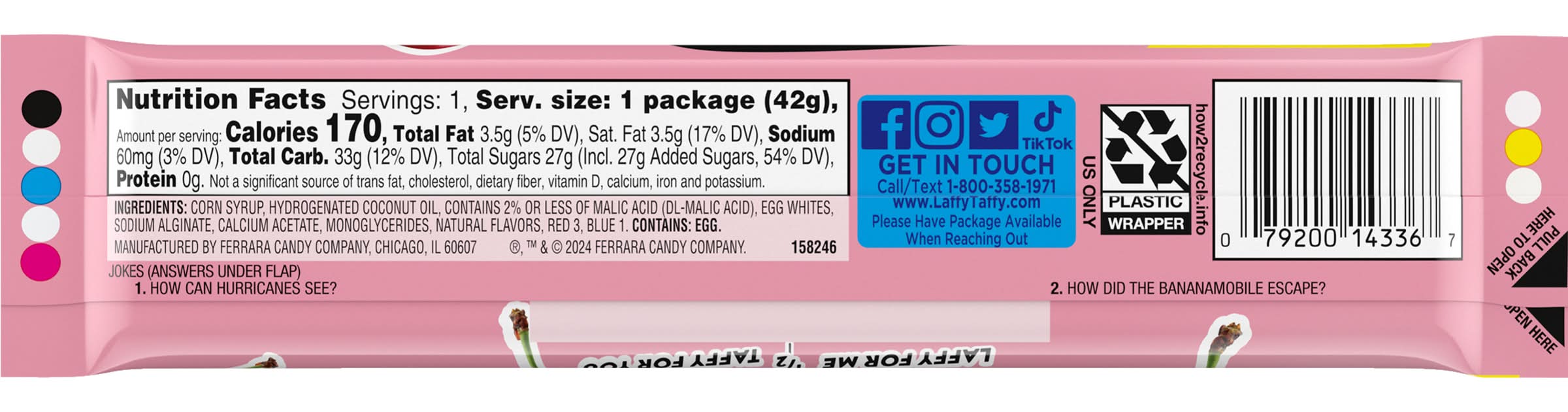 Laffy Taffy Stretchy & Tangy Cherry Candy offers a cherry flavor complemented by other natural flavors, providing a unique taste experience. Each bar contains 180 calories and includes nutrition information, specifically regarding saturated fat content, for consumer reference. Adding an element of fun, jokes are featured on every wrapper, with answers located under the flap, inviting a moment of laughter with each serving.