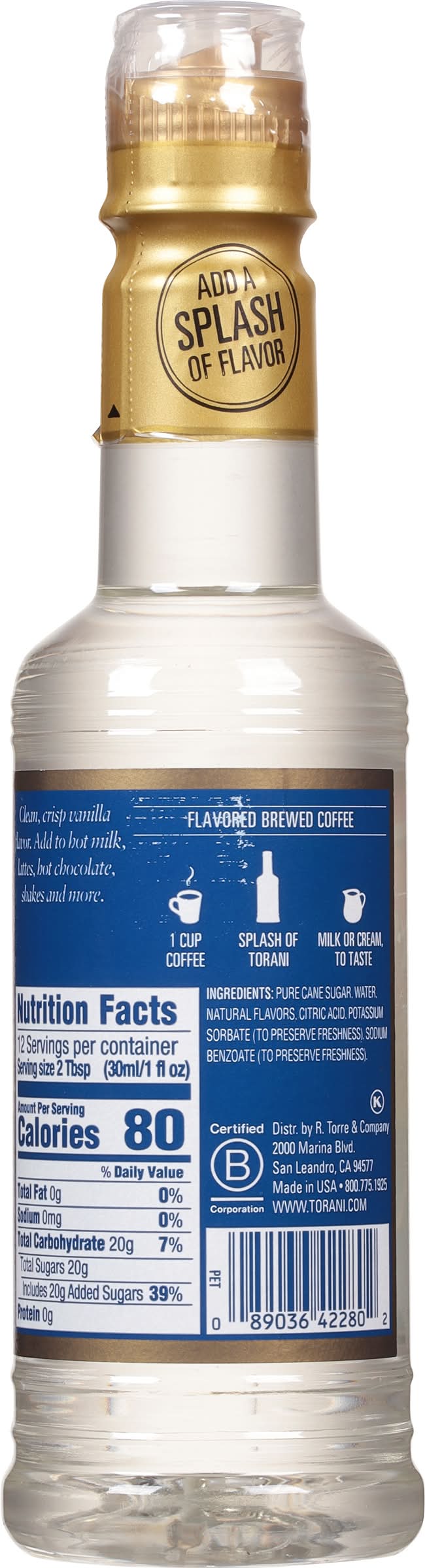 Clean, crisp vanilla flavor. Add to hot milk, lattes, hot chocolate, shakes and more. Flavored Brewed Coffee 1 Cup Coffee Splash of Torani Milk or Cream, to taste Flavor: Vanilla