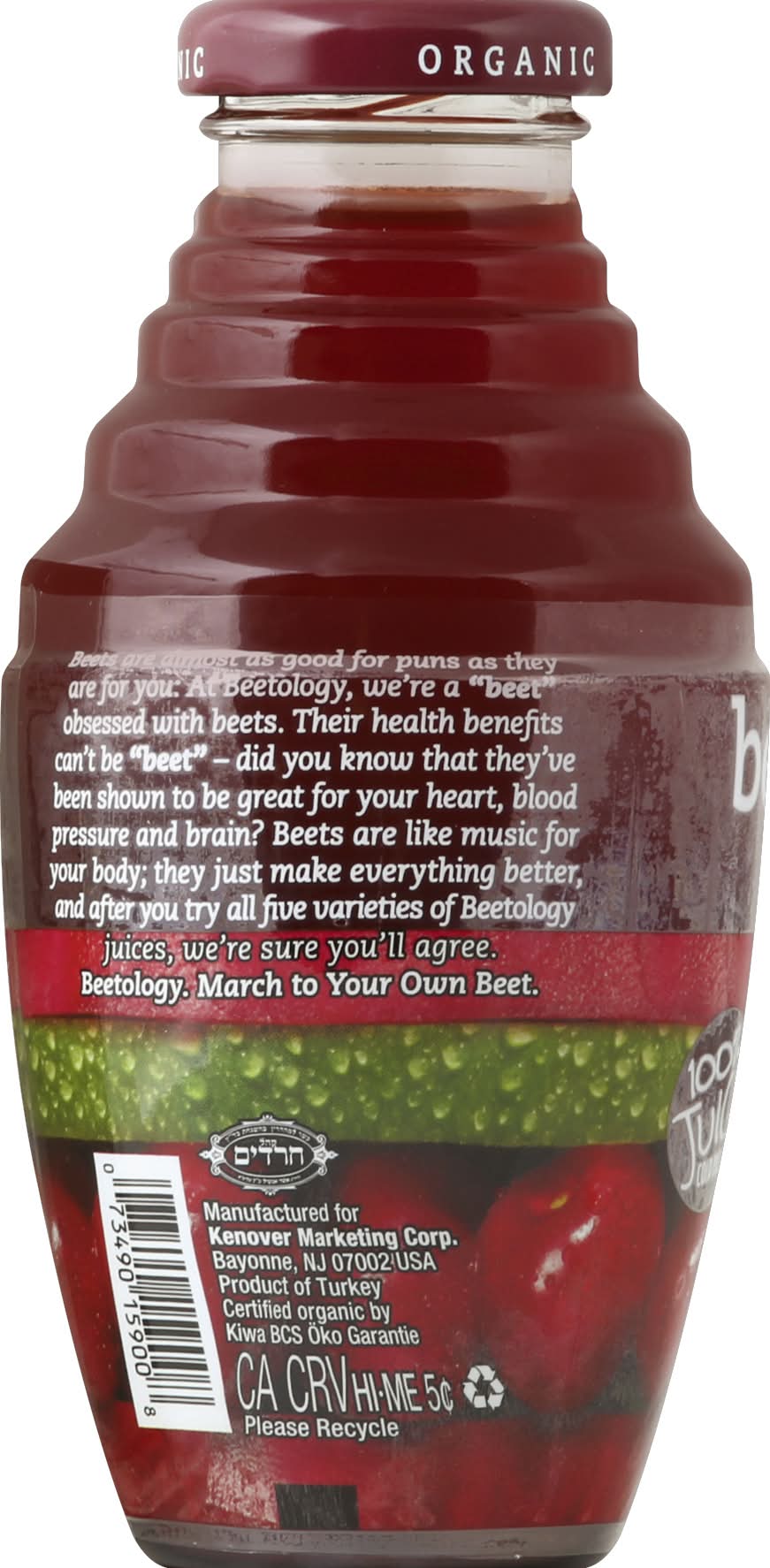 Cold pressed. Non GMO Project verified. nongmoproject.org. Certified Fair Trade. FairTSA.org. USDA Organic. Certified Organic by Kiwa BCS Oko Garantie. 100% juice. No concentrate. Made from 100% fruits and vegetables. Beets are almost as good for puns as they are for you. At Beetology, we're a beet obsessed with beets. Their health benefits can't be beet - did you know that they've been shown to be great for your heart, blood pressure and brain? Beets are like music for your body; they just make everything better, and after you try all five varieties of Beetology juices, we're sure you'll agree. Beetology. March to your own beet. Please recycle. Product of Turkey. • Flavor: Beet-cherry • Size: 8.45 OZ • Kenover Marketing Corp., Bayonne, NJ, 07002, USA • Packaging: Reusable