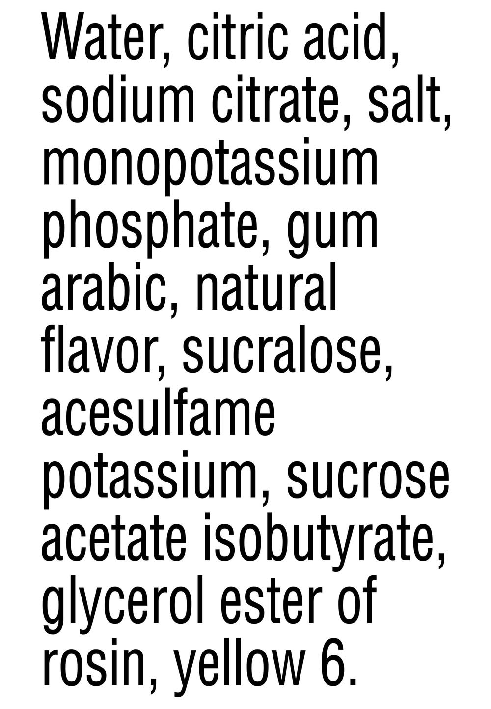 Ingredients: Water, Citric Acid, Sodium Citrate, Salt, Monopotassium · Phosphate, Gum Arabic, Natural Flavor, Sucralose, Acesulfame · Potassium, Sucrose Acetate Isobutyrate, Glycerol Ester of Rosin, Yellow 6