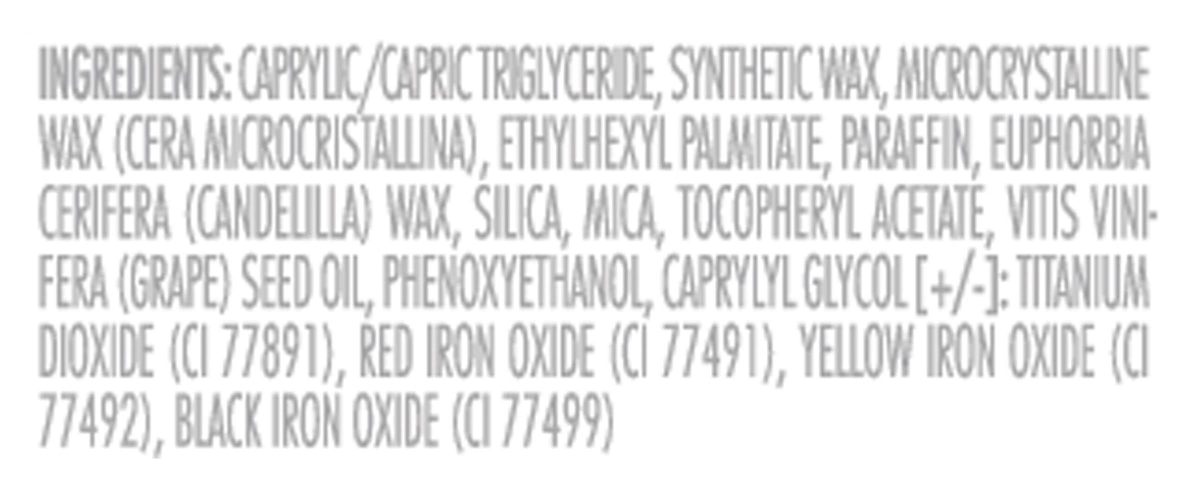 Ingredients: Caprylic/Capric Triglyceride, Synthetic Wax, Microcrystalline Wax (Cera Microcristallina), Ethylhexyl Palmitate, Paraffin, Euphorbia Cerifera (Candelilla) Wax, Silica, Mica, Tocopheryl Acetate, Vitis Vinifera (Grape) Seed Oil, Phenoxyethanol, Caprylyl Glycol [+/-]: Titanium Dioxide (CI 77891), Red Iron Oxide (CI 77491), Yellow Iron Oxide (CI 77492), Black Iron Oxide (CI 77499)