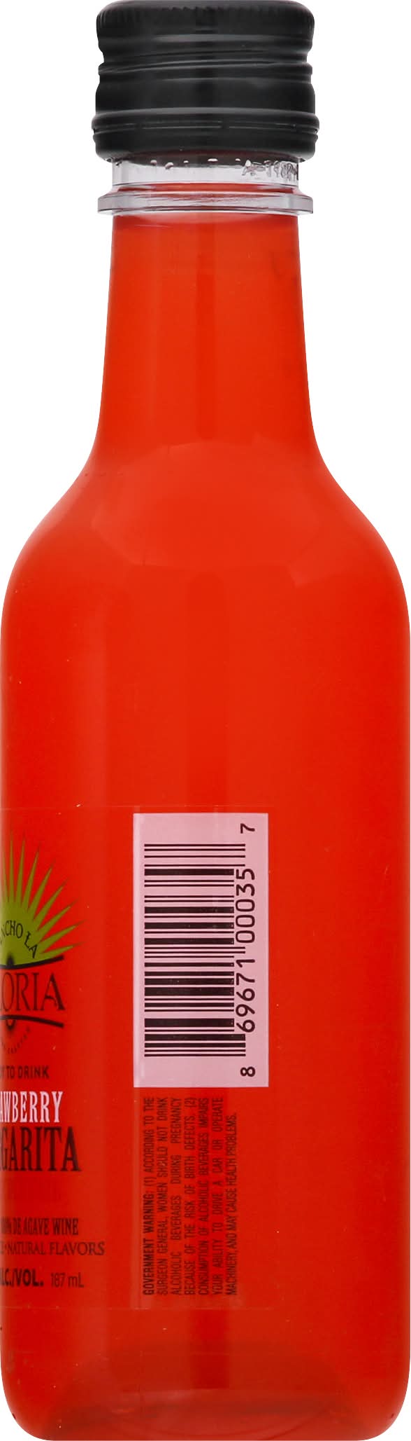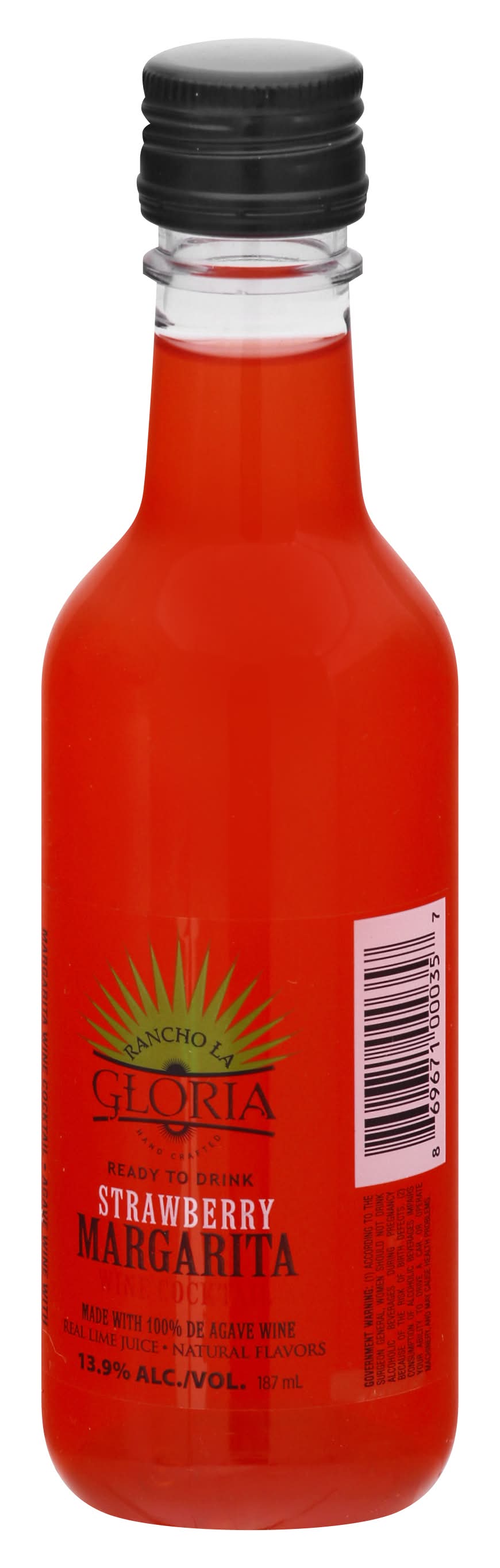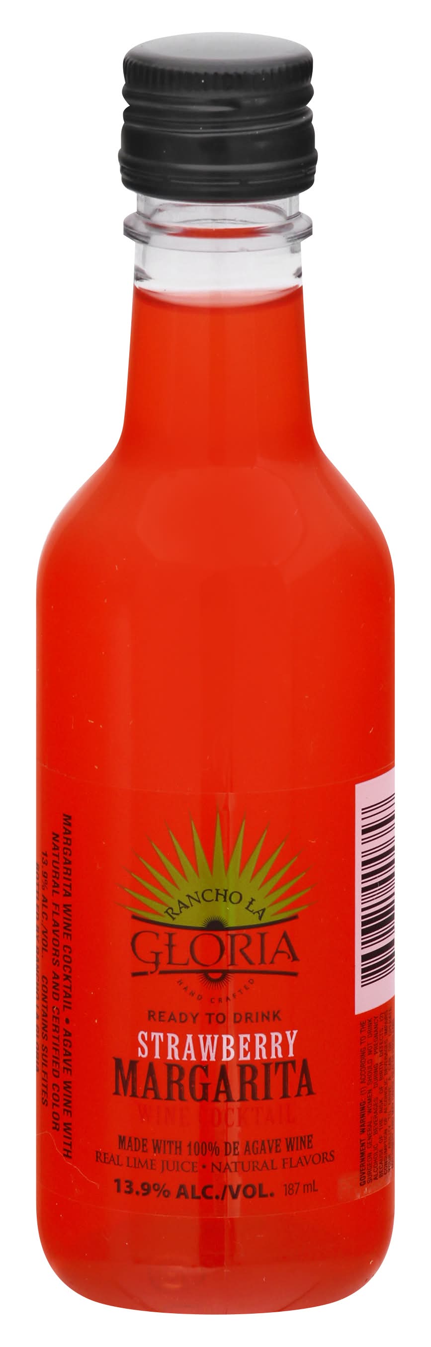 Limited Edition Wine cocktail. Real lime juice. Natural flavors. Margarita made with 100% de agave wine. Ready to drink. Hand crafted. Mexico 1938 the original Margarita was invented at the Rancho La Gloria Hotel. Enjoy this authentic recipe! Margarita wine cocktail agave wine with natural flavors and certified color. rancholagloria.com. 13.9% alc./vol. 27.8 Produced and Bottled by MPL Brands, Mira Loma, CA 91752. • Brand: Rancho la gloria • Flavor: Strawberry • Alcohol by volume: 13.9%
