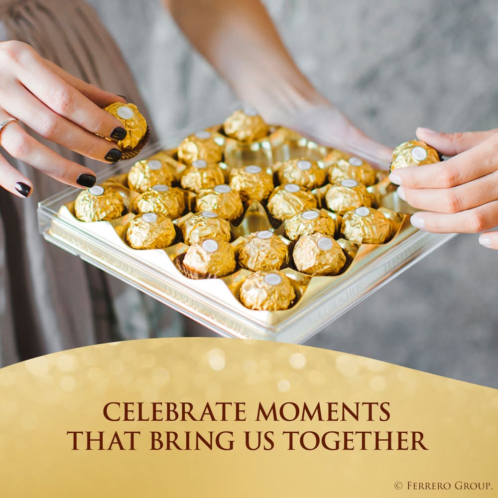Ferrero Rocher's milk chocolate gift box offers a unique taste experience of contrasting layers: a whole crunchy hazelnut in the heart and a delicious, creamy hazelnut filling surrounded with milk chocolate, crispy wafers and gently roasted hazelnut pieces. And thanks to its signature golden wrapper, Ferrero Rocher is even more unique and special. The iconic original. Celebrate the moment with Ferrero Rocher. Since the 1940s, Ferrero has delighted consumers with premium, one-of-a-kind chocolate treats. What began as a local pasticceria in Italy’s Piemonte region is now one of the world’s most popular confectioners, satisfying cravings in over 100 countries worldwide. Thanks to a commitment to quality, freshness and a unique taste experience, Ferrero continues to delight chocolate lovers all over the world.
