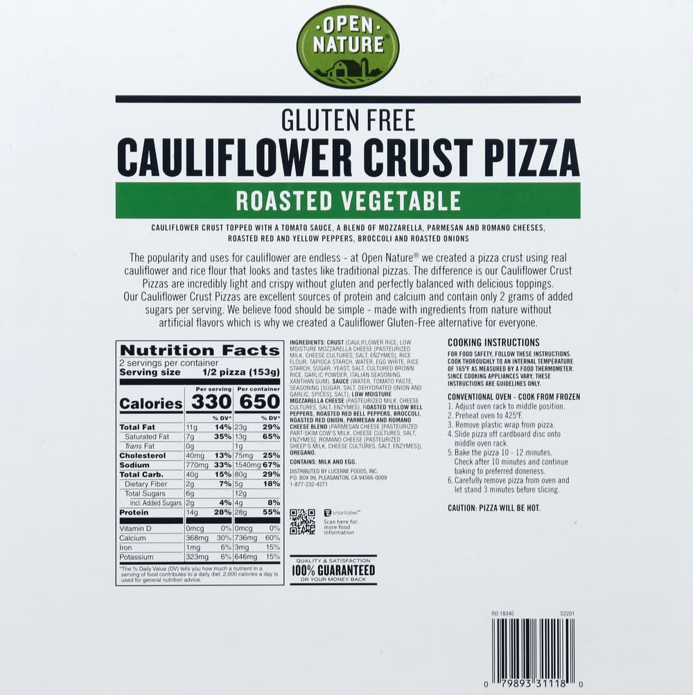 Crust (Cauliflower Rice, Low Moisture Mozzarella Cheese [Pasteurized Milk, Cheese Cultures, Salt, Enzymes], Rice Flour, Tapioca Starch, Water, Egg White, Rice Starch, Sugar, Yeast, Salt, Cultured Brown Rice, Garlic Powder, Italian Seasoning, Xanthan Gum), Sauce (Water, Tomato Paste, Seasoning [Sugar, Salt, Dehydrated Onion and Garlic, Spices], Salt), Low Moisture Mozzarella Cheese (Pasteurized Milk, Cheese Cultures, Salt, Enzymes), Roasted Yellow Bell Peppers, Roasted Red Bell Peppers, Broccoli, Roasted Red Onion, Parmesan and Romano Cheese Blend (Parmesan Cheese [Pasteurized Part-Skim Cow's Milk, Cheese Cultures, Salt, Enzymes], Romano Cheese [Pasteurized Sheep's Milk, Cheese Cultures, Salt, Enzymes]), Oregano. Contains: Milk, Eggs