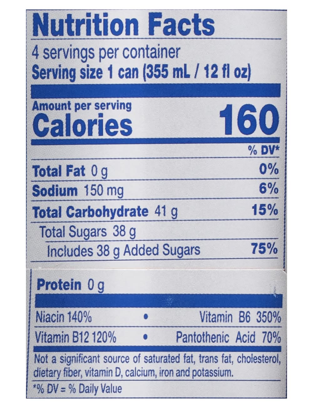 Ingredients: Carbonated Water, Sugar, Glucose, Citric Acid, Taurine, Natural and Artificial Flavors, Sodium Bicarbonate (Baking Soda), Magnesium Carbonate, Colors, Caffeine, Niacinamide, Pyridoxine HCl (Vitamin B6), Calcium Pantothenate, Vitamin B12