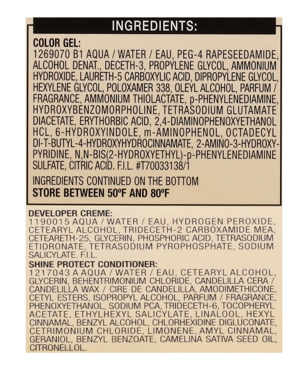 Ingredients: Color Gel: 1269070 B1 - Aqua/Water/Eau, PEG-4 Rapeseedamide, Alcohol Denat, Deceth-3, Propylene Glycol, Ammonium Hydroxide, Laureth-5 Carboxylic Acid, Dipropylene Glycol, Hexylene Glycol, Poloxamer 338, Oleyl Alcohol, Parfum/Fragrance, Ammonium Thiolactate, P-Phenylenediamine, Hydroxybenzomorpholine, Tetrasodium Glutamate Diacetate, Erythorbic Acid, 2, 4-Diaminophenoxyethanol HCl, 6-Hydroxyindole, M-Aminophenol, Octadecyl Di-T-Butyl-4-Hydroxyhydrocinnamate, 2-Amino-3-Hydroxy-Pyridine, N, N-Bis(2-Hydroxyethyl)-P-Phenylenediamine Sulfate, Citric Acid. Developer Creme: 1190015 - Aqua/Water/Eau, Hydrogen Peroxide, Cetearyl Alcohol, Trideceth-2 Carboxamide MEA, Ceteareth-25, Glycerin, Phosphoric Acid, Tetrasodium Etidronate, Tetrasodium Pyrophosphate, Sodium Salicylate. Shine Protect Conditioner: 1217043 A - Aqua/Water/Eau, Cetearyl Alcohol, Glycerin, Behentrimonium Chloride, Candelilla Cera/Candelilla Wax/Cire De Candelilla, Amodimethicone, Cetyl Esters, Isopropyl Alcohol, Parfum/Fragrance, Phenoxyethanol, Sodium PCA, Trideceth-6, Tocopheryl Acetate, Ethylhexyl Salicylate, Linalool, Hexyl Cinnamal, Benzyl Alcohol, Chlorhexidine Digluconate, Cetrimonium Chloride, Limonene, Amyl Cinnamal, Geraniol, Benzyl Benzoate, Camelina Sativa Seed Oil, Citronellol, F.I.L. #T70033138/1. F.I.L. #D209747/8. F.I.L. #D255219/1