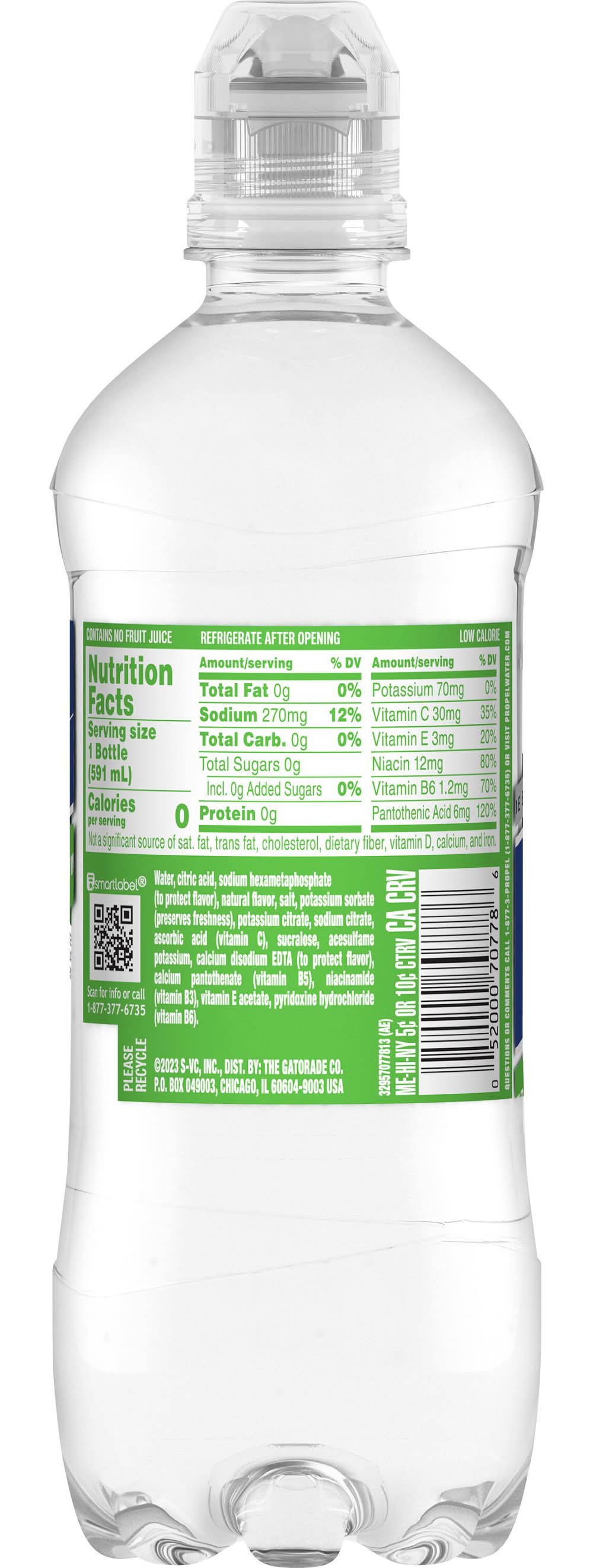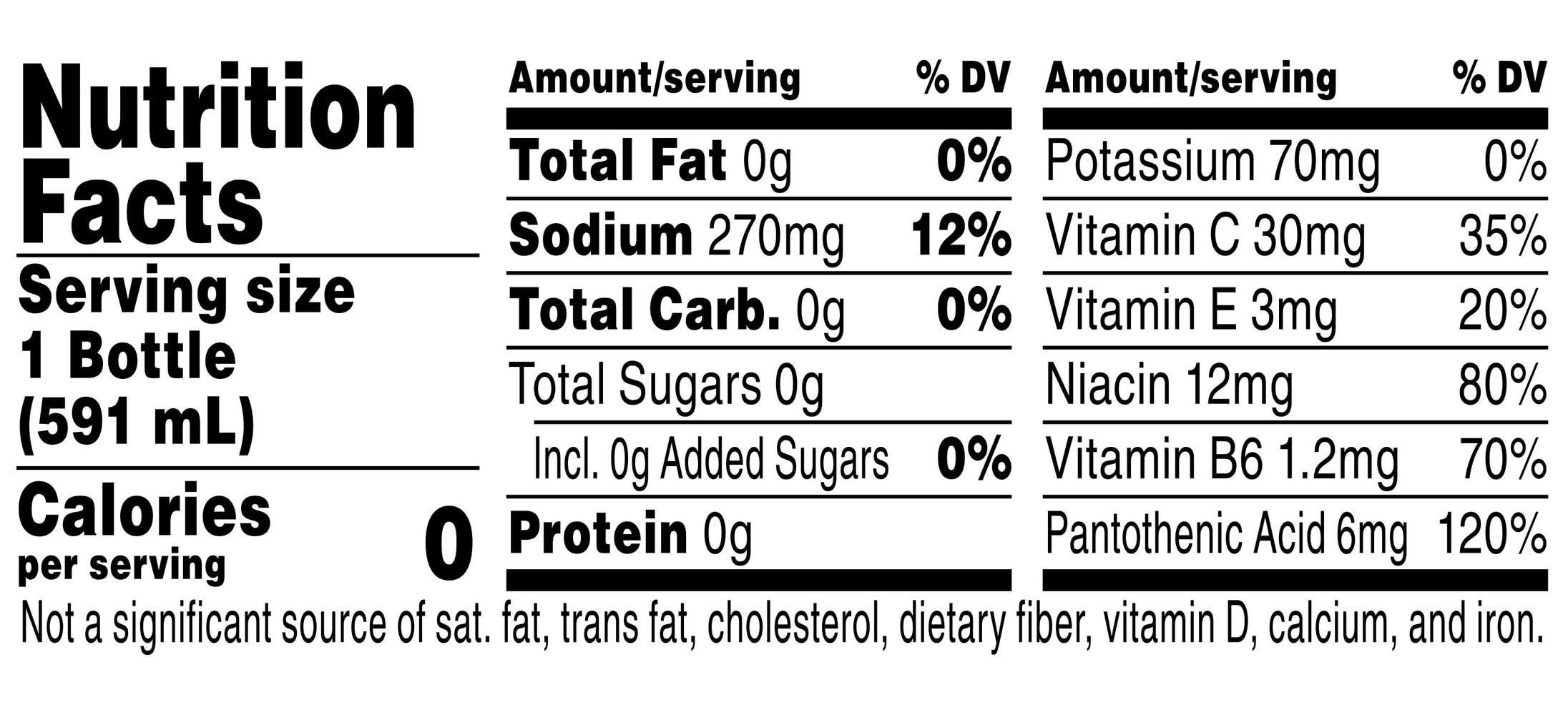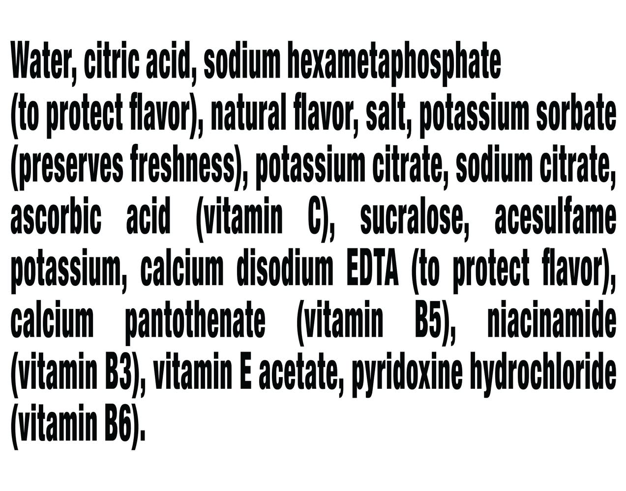 Ingredients: Water, Citric Acid, Sodium Hexametaphosphate (To Protect Flavor), Natural Flavor, Salt, Potassium Sorbate (Preserves Freshness), Potassium Citrate, Sodium Citrate, Ascorbic Acid (Vitamin C), Sucralose, Acesulfame Potassium, Calcium Disodium EDTA (To Protect Flavor), Calcium Pantothenate (Vitamin B5), Niacinamide (Vitamin B3), Vitamin E Acetate, Pyridoxine Hydrochloride (Vitamin B6)