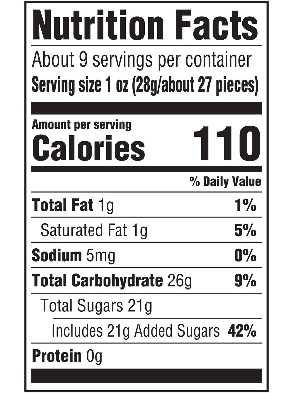 Ingredients: Sugar, Corn Syrup, Hydrogenated Palm Kernel Oil; Less than 2% of: Citric Acid, Tapioca Dextrin, Modified Corn Starch, Natural and Artificial Flavors, Sodium Citrate, Colors (Yellow 5 Lake, Red 40 Lake, Blue 2 Lake, Blue 1 Lake, Yellow 6 Lake, Blue 1, Yellow 6, Red 40, Yellow 5), Carnauba Wax.
