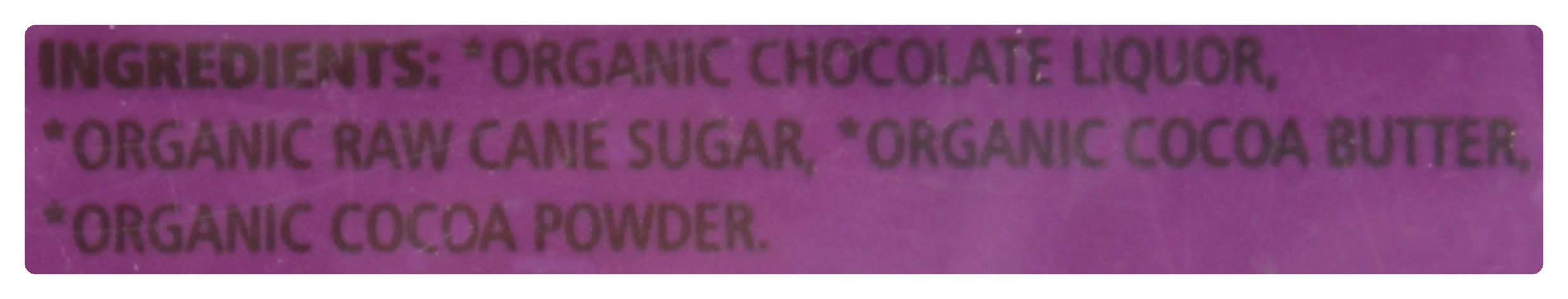 Organic Chocolate Liquor (Fair Trade Ingredients: By Weight 100% From Fair Trade Cooperatives), Organic Raw Cane Sugar (Fair Trade Ingredients: By Weight 100% From Fair Trade Cooperatives), Organic Cocoa Butter (Fair Trade Ingredients: By Weight 100% From Fair Trade Cooperatives), Organic Cocoa Powder (Fair Trade Ingredients: By Weight 100% From Fair Trade Cooperatives) Contains: 'Free From Peanuts', 'Free From Tree Nuts', 'Free From Milk', 'Free From Eggs', 'Free From Soybeans', 'Free From Gluten', 'Free From Wheat'