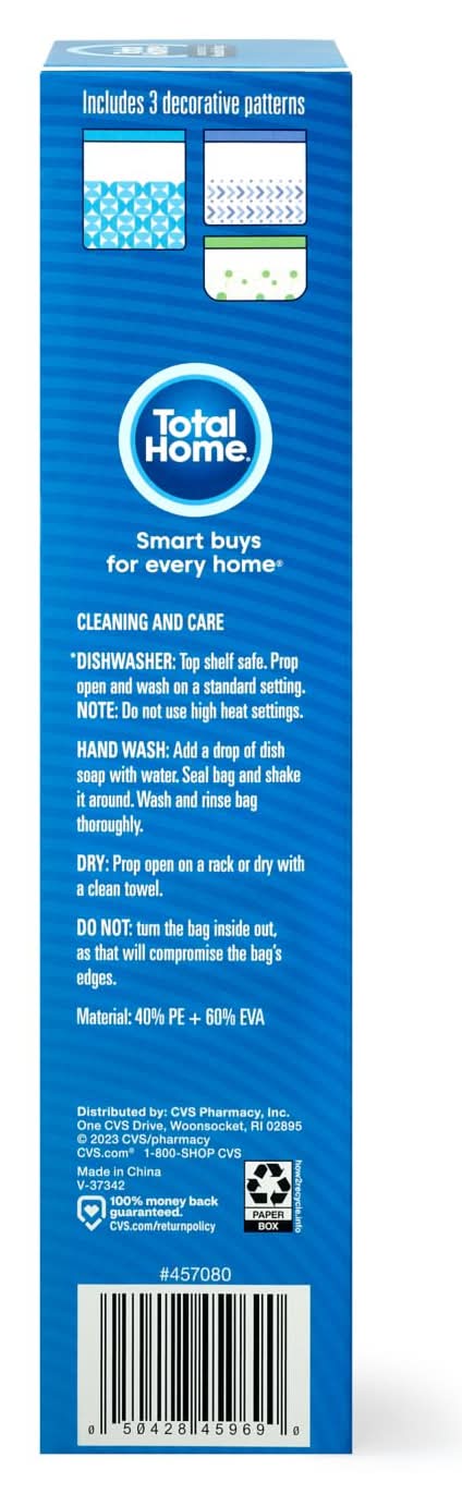 BPA-free reusable storage bags Sustainable alternative to single-use plastic bags Refrigerator and freezer-safe for versatile food storage Dishwasher-safe and hand-washable for easy cleaning Leakproof seal prevents messes Snack, sandwich and quart bags to meet different needs Try them risk-free with our CVS 100% money-back guarantee Cut down on waste while storing food conveniently with these Total Home® assorted size reusable bags. Dishwasher-safe for easy cleaning, these bags can be used multiple times instead of being tossed after one use, making them a sustainable alternative to traditional plastic storage bags. You can also hand-wash the bags before the next use. Refrigerator- and freezer-safe, these bags can store all types of food, and they're leakproof with an airtight seal to keep items contained – plus they are dishwasher-safe for east cleaning! Each package of Total Home assorted reusable bags includes snack, sandwich and quart sizes with two bags of each size to give you an option for a variety of food and other items. You also get a mix of clear and patterned bags for a fun touch to food storage. Total Home assorted-size reusable bags are made of food-safe and BPA-free PE and EVA. Use them to pack your lunch, store leftovers, or prep snacks for car rides. The TSA-friendly quart bags also work well for non-food items, such as office supplies, toys and makeup!Smart buys for every home® At Total Home® we know your home and family deserve the best. Our full range of hardworking products deliver great performance and a smart value. Size: Assorted