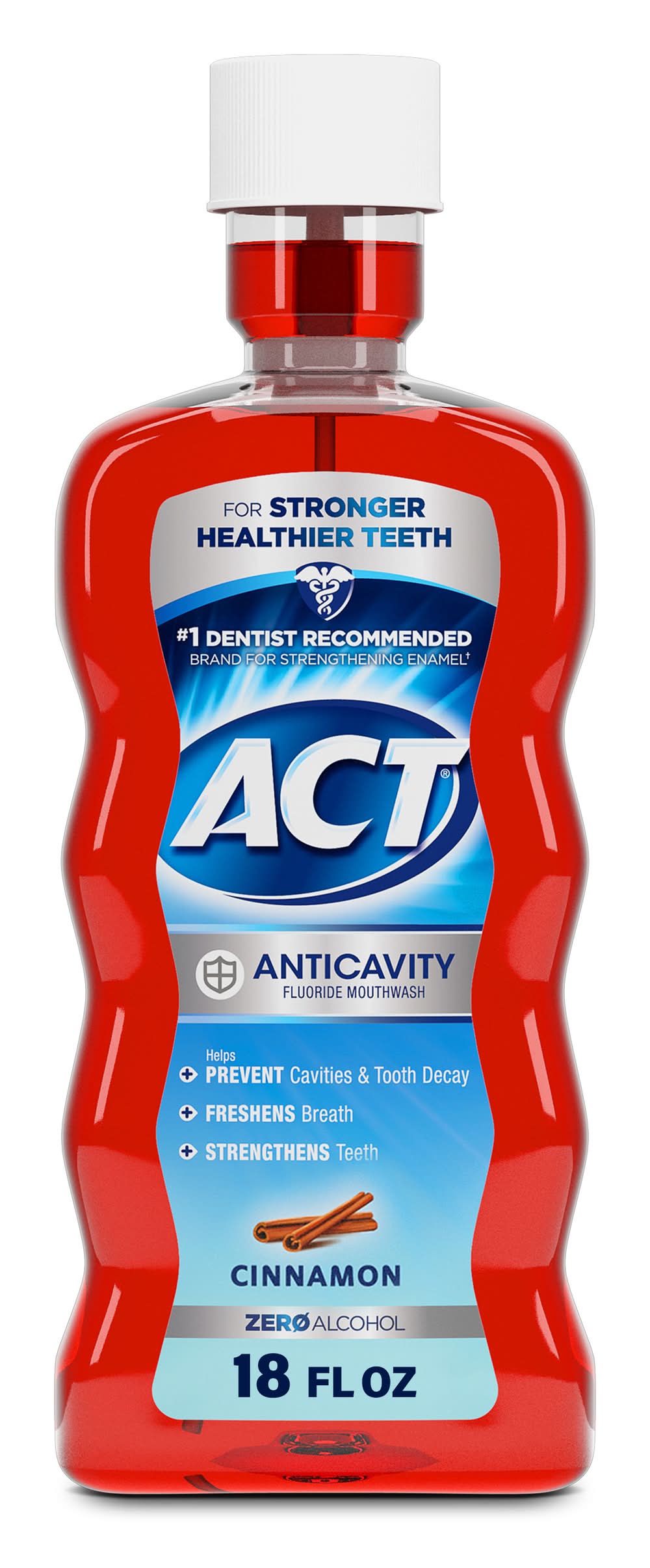 ACT Anticavity Fluoride Mouthwash, Cinnamon Flavor • Size: 18 OZ • Chattem, Inc., PO Box 2219, Chattanooga, TN, 37409