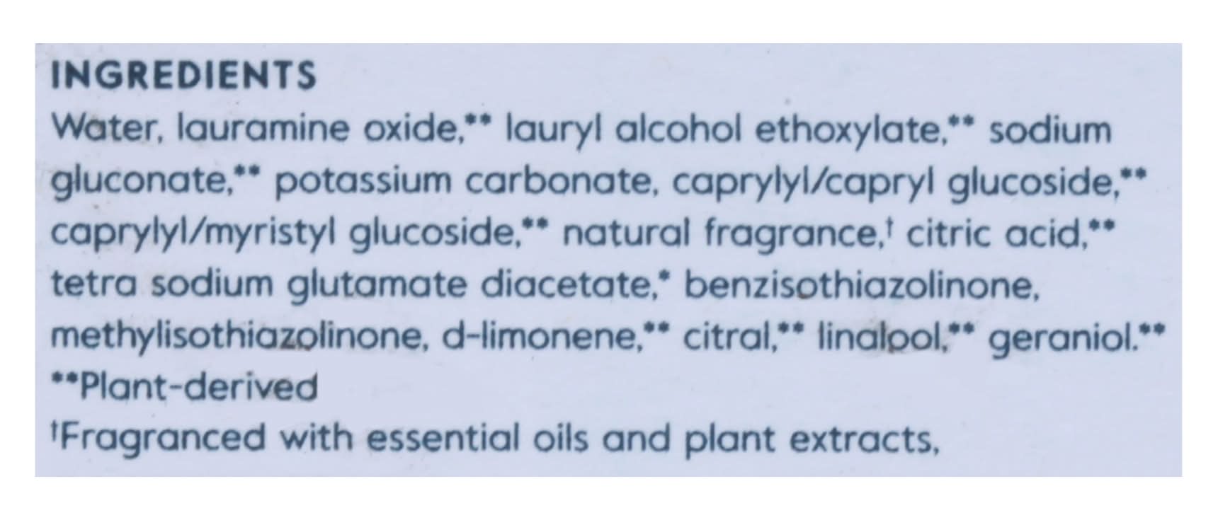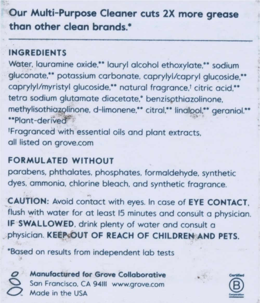 Water, Lauramine Oxide (Plant-Derived), Lauryl Alcohol Ethoxylate (Plant-Derived) Sodium Gluconate (Plant-Derived), Potassium Carbonate, Caprylyl/Capryl Glucoside (Plant-Derived), Caprylyl/Myristyl Glucoside (Plant-Derived), Natural Fragrance (Fragranced with Essential Oils and Plant Extracts, All Listed on Grove.Com), Citric Acid (Plant-Derived), Tetra Sodium Glutamate Diacetate (Plant-Derived), Benzisothiazolinone, Methylisothiazolinone, D-Limonene (Plant-Derived), Citral (Plant-Derived), Linalool (Plant-Derived), Geraniol (Plant-Derived) Additives: None