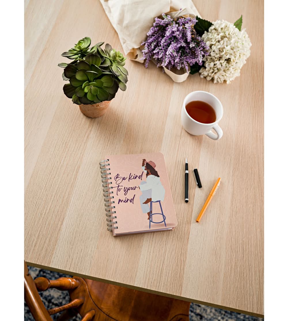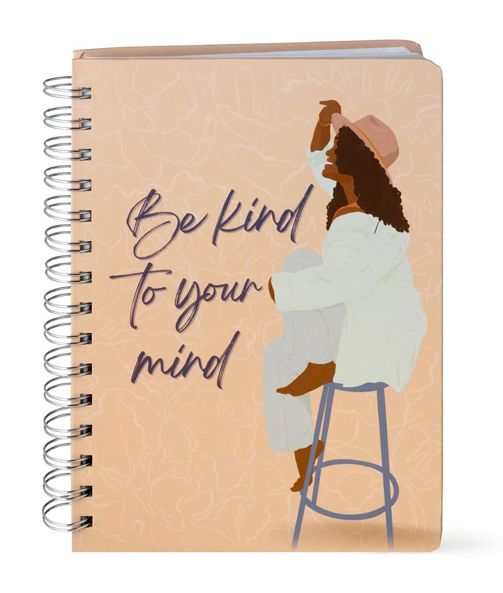 Designed by an independent artist. This inspirational journal encourages artists around the world to spark their creativity. 6" x 8" 200 lined pages High Quality Materials Twin wire binding Front reads: "Be kind to your mind" Size: 6 in X 8 In
