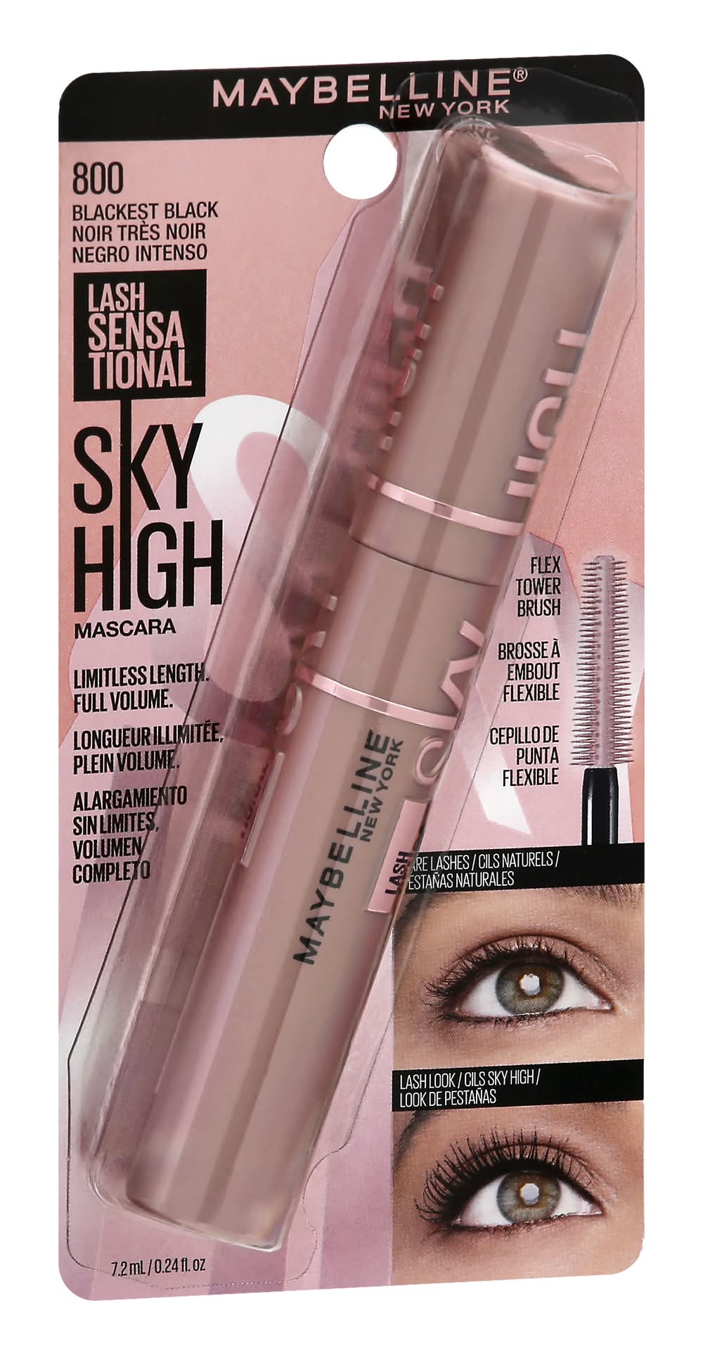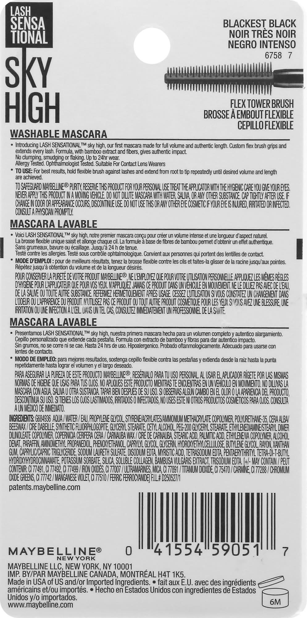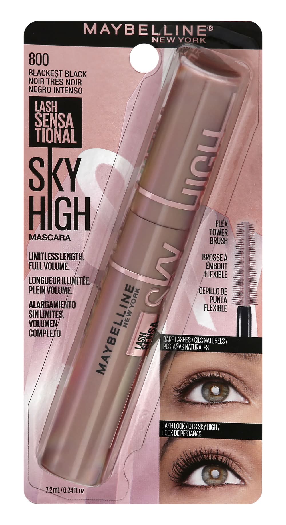 Limitless length. Full volume. Flex tower brush. Bare lashes. Lash look. Washable Mascara: Introducing Lash Sensational Sky High, our first mascara made for full volume and authentic length. Custom flex brush grips and extends every lash. The formula, with bamboo extract and fibers, gives an authentic impact. No clumping, smudging, or flaking. Up to 24 hr wear. • Color: Blackest black 800 • Maybelline LLC, New York, NY, 10001