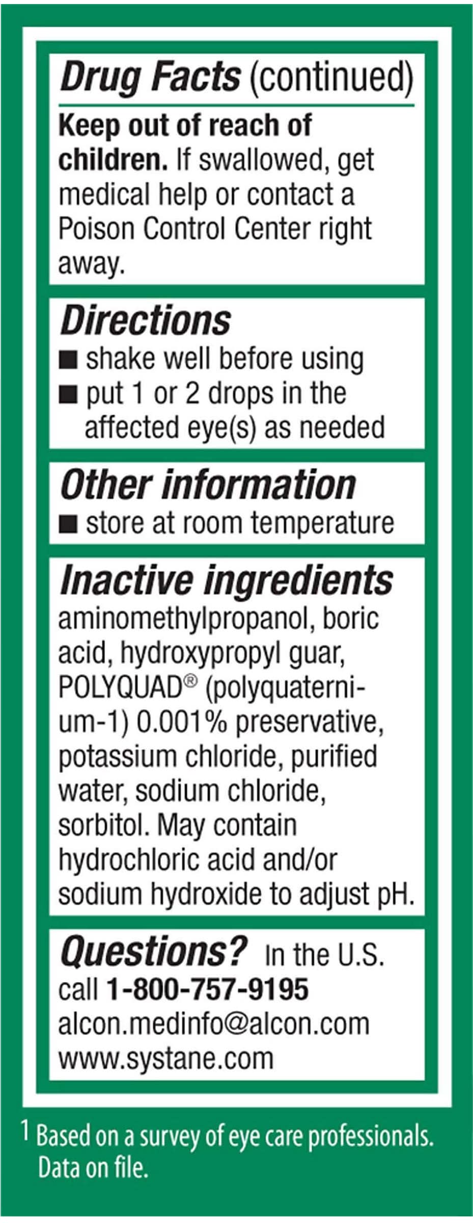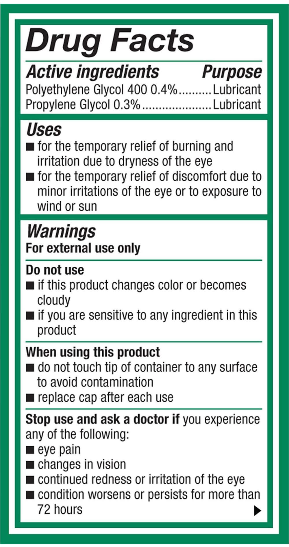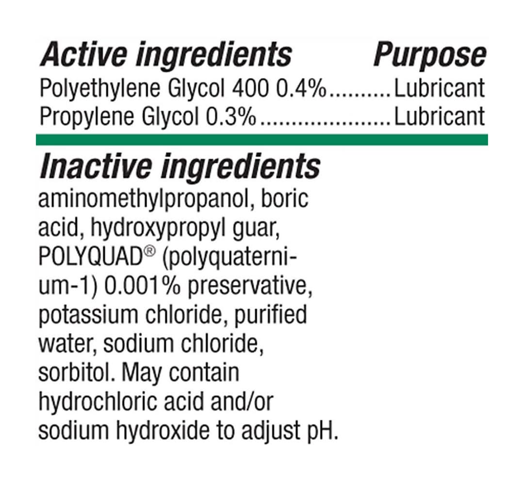 Ingredients: Active Ingredients: Polyethylene Glycol 400 (0.4 %), Lubricant; Propylene Glycol (0.3 %), Lubricant. Inactive Ingredients: Aminomethylpropanol, Boric Acid, Hydroxypropyl Guar, POLYQUAD (Polyquaternium-1) 0.001% preservative, Potassium Chloride, Purified Water, Sodium Chloride, Sorbitol, May Contain Hydrochloric Acid and/or Sodium Hydroxide to Adjust pH