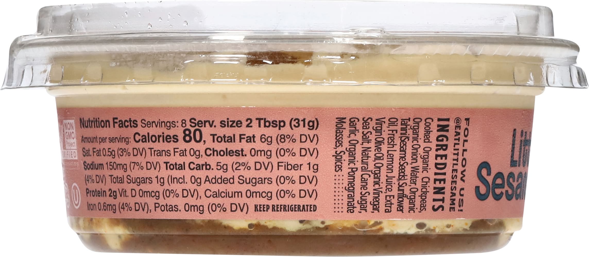 Cooked Organic Chickpeas, Organic Onion, Water, Organic Tahini (Sesame Seeds), Sunflower Oil, Fresh Lemon Juice, Extra Virgin Olive Oil, Organic Vinegar, Sea Salt, Natural Cane Sugar, Garlic, Organic Pomegranate Molasses, Spices ⠀⠀⠀⠀⠀⠀⠀⠀⠀⠀ Contains: Sesame