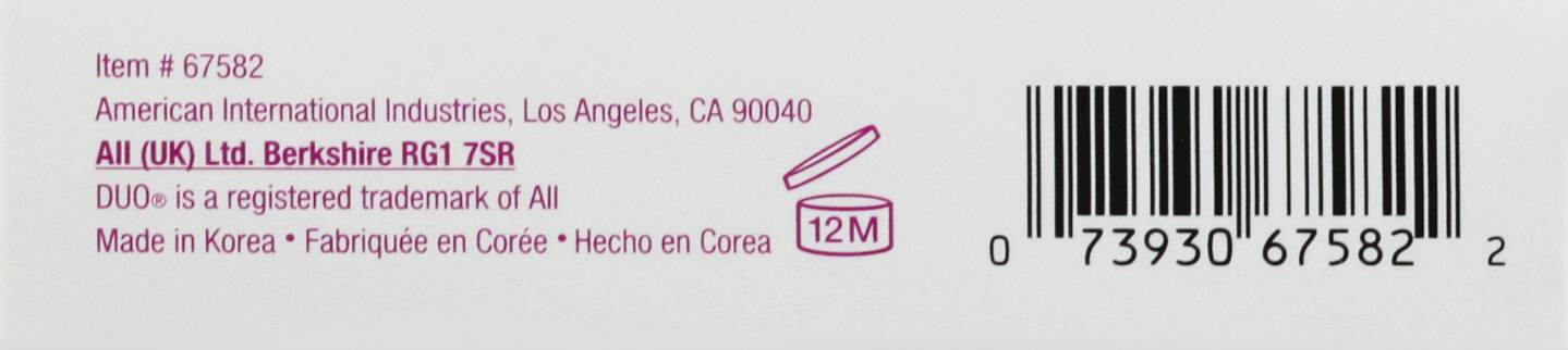 Formaldehyde free. Long-lasting. Water-resistant. Latex free. Dries dark. Silicone applicator. Sets in seconds. New. Further information included. duoadhesives.com. (hashtag)duoadhesive. (at)duoadhesive. Facebook. Pinterest. Instagram. YouTube. Join our beauty network. duoadhesives.com. Made in Korea.