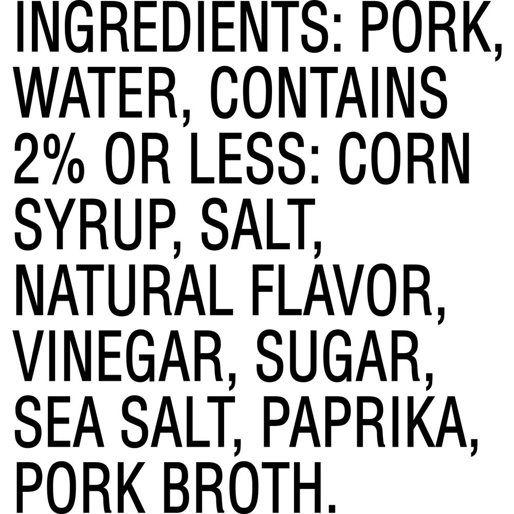 Ingredients: Pork, Water, Contains 2% Or Less: Corn Syrup, Salt, Natural Flavor, Vinegar, Sugar, Sea Salt, Paprika, Pork Broth. Contains: Corn
