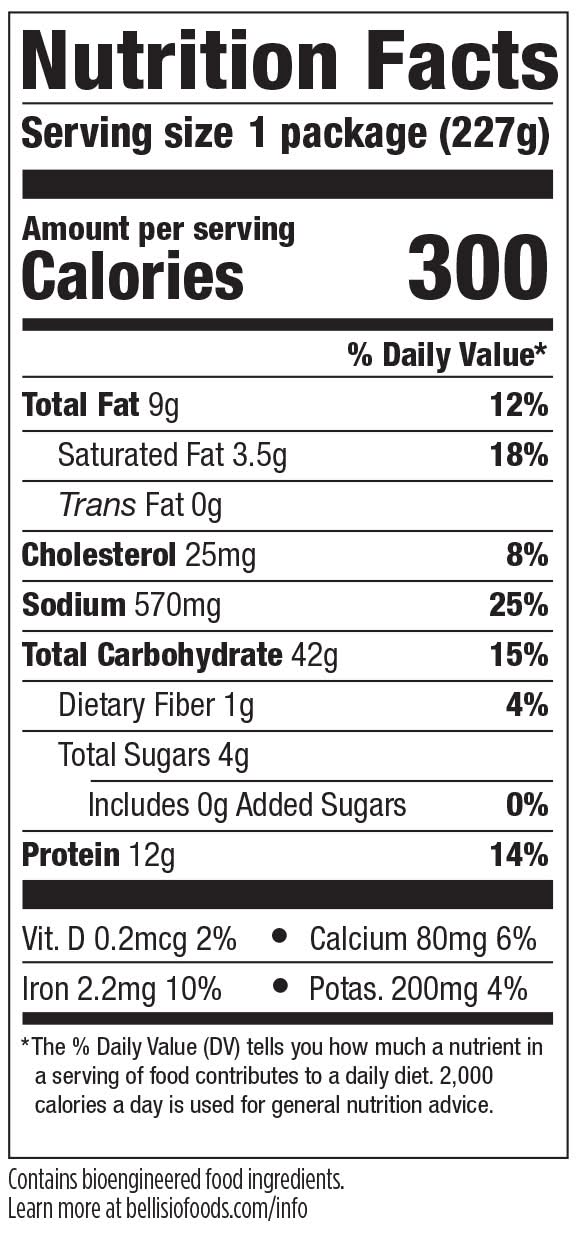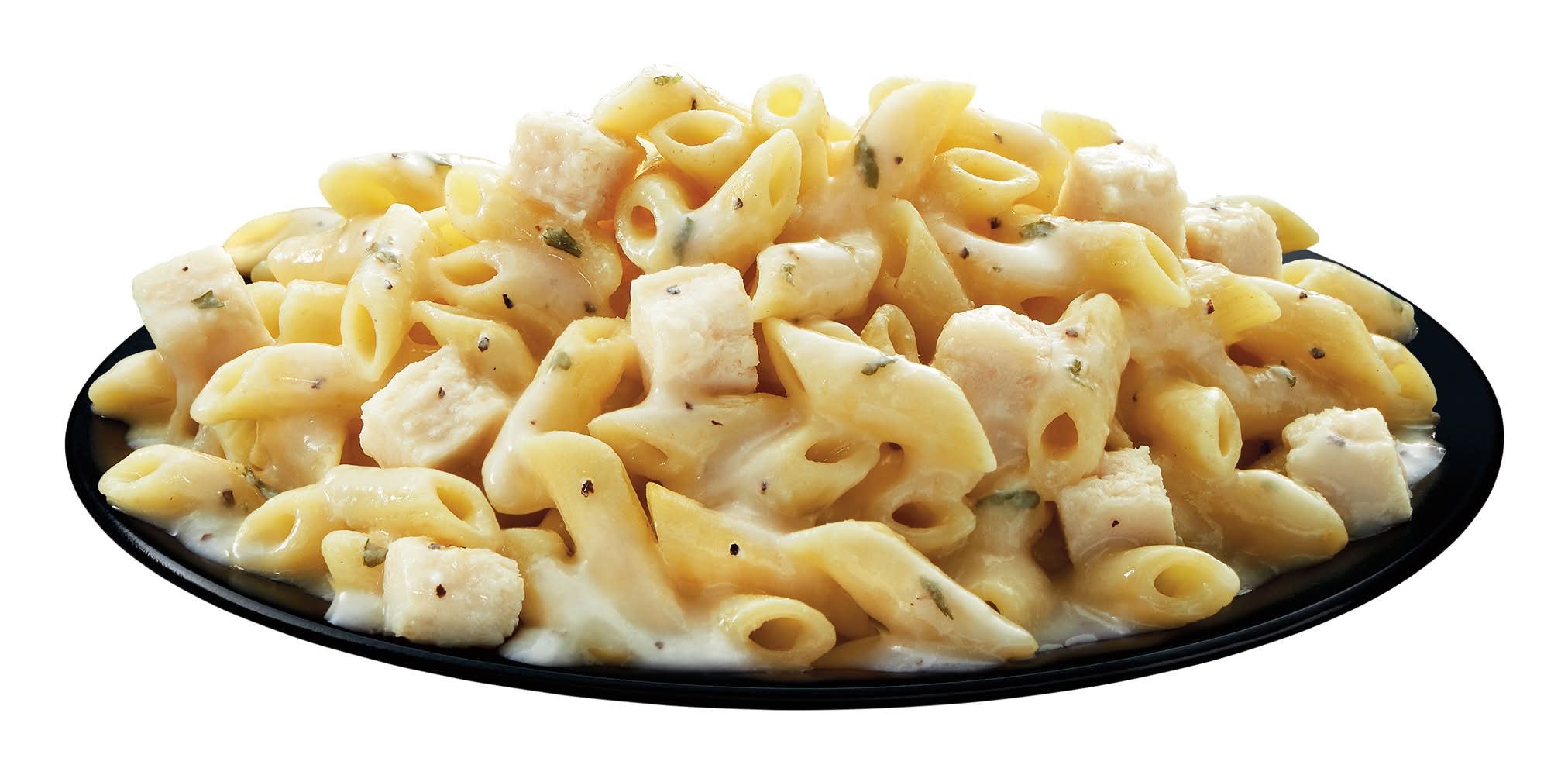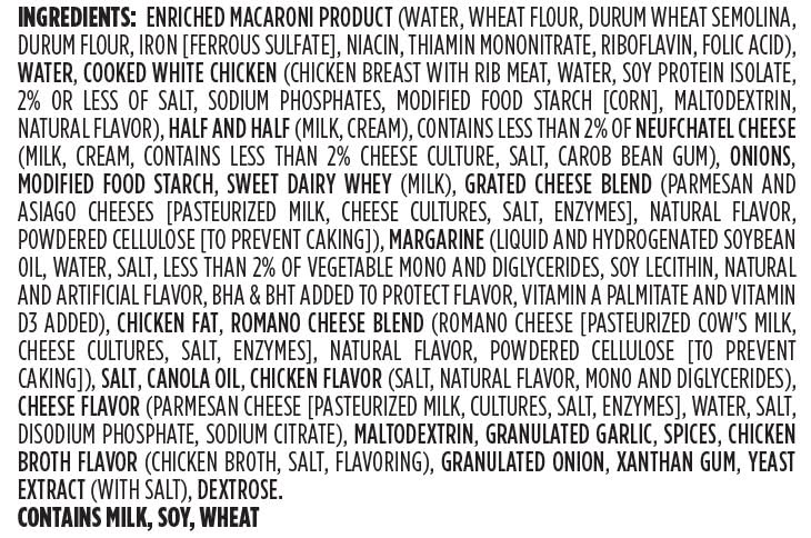 Ingredients: Enriched Macaroni Product Water, Durum Wheat Semolina, Wheat Flour, Niacin, Ferrous Sulfate, Thiamine Mononitrate, Riboflavin, Folic Acid, Water, Cooked White Chicken Chicken Breast with Rib Meat, Water, Soy Protein Isolate, 2% or Less of Salt, Sodium Phosphate, Modified Food Starch, Maltodextrin and Natural Flavor, Half and Half Milk, Cream, Contains Less than 2% of Neufchatel Cheese Milk, Cream, Contains Less than 2% Cheese Culture, Salt, Carob Bean Gum, Onions, Modified Food Starch, Sweet Dairy Whey, Grated Cheese Blend Parmesan and Asiago Cheeses [Pasteurized Milk, Cheese Cultures, Salt, Enzymes], Natural Flavor, Powdered Cellulose [to Prevent Caking], Margarine Liquid and Hydrogenated Soybean Oil, Water, Salt, Less than 2% of Vegetable Mono and Diglycerides, Soy Lecithin, Natural and Artificial Flavor, BHA & BHT Added to Protect Flavor, Vitamin A Palmitate and Vitamin D3 Added, Chicken Fat, Romano Cheese Blend Romano Cheese [Pasteurized Cow's Milk, Cheese Cultures, Salt, Enzymes], Natural Flavor, Powdered Cellulose [to Prevent Caking], Salt, Canola Oil, Chicken Flavor Salt, Natural Flavor, Mono and Diglycerides, Cheese Flavor Parmesan Cheese [Pasteurized Milk, Cultures, Salt, Enzymes], Water, Salt, Disodium Phosphate, Sodium Citrate, Maltodextrin, Granulated Garlic, Spices, Chicken Broth Flavor Chicken Broth, Salt, Flavoring, Granulated Onion, Xanthan Gum, Yeast Extract, Dextrose, Parsley. Contains: Milk, Soy, Wheat