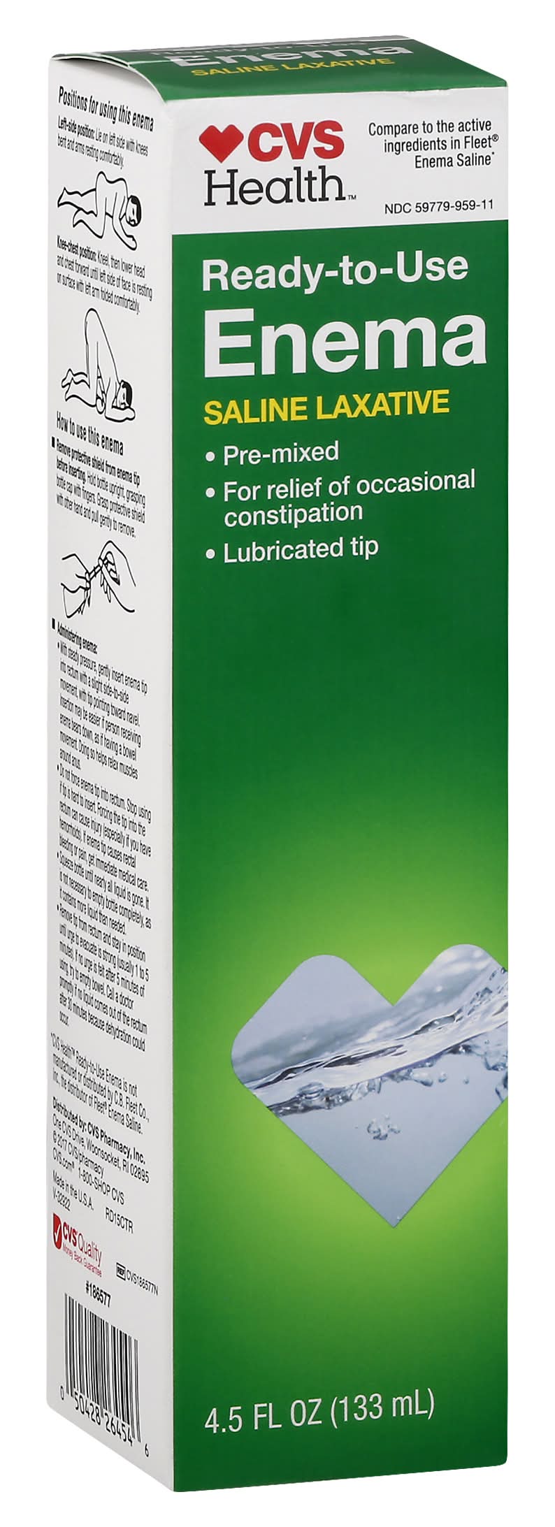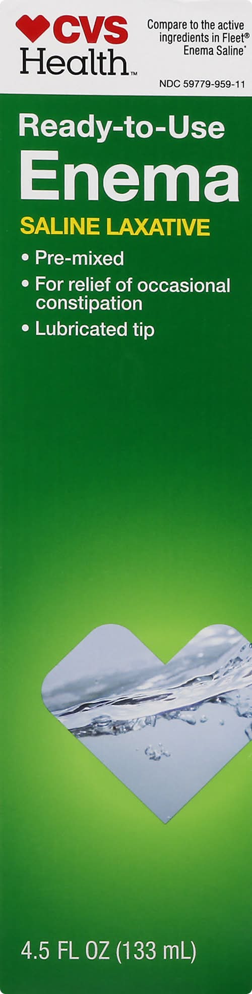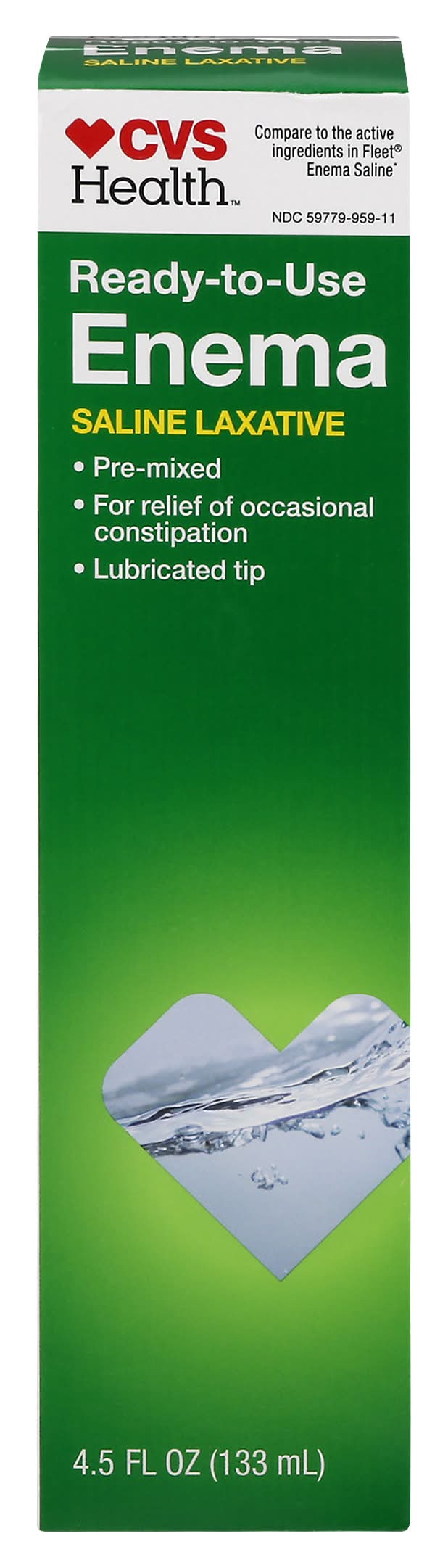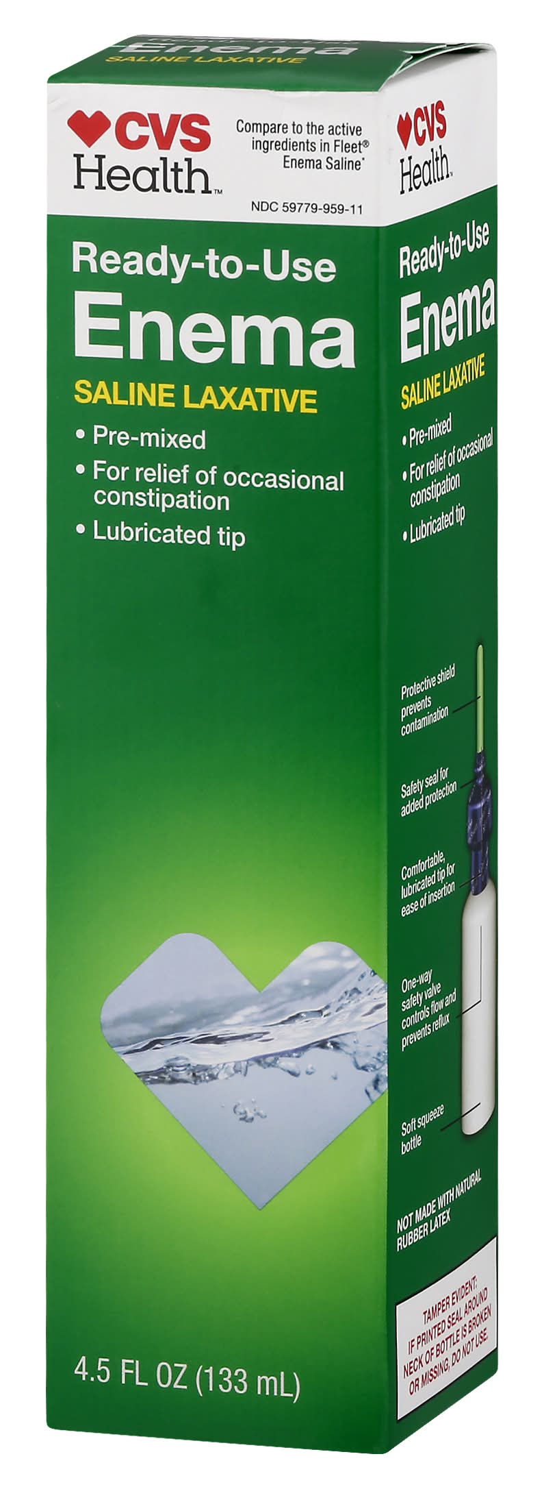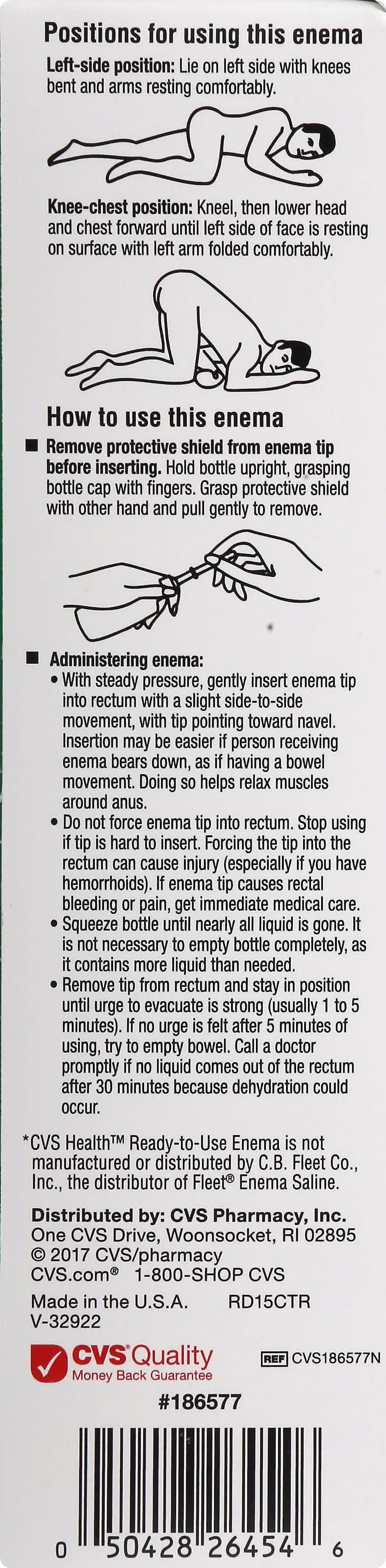 Compare to the active ingredients in Fleet Enema Saline (CVS Health Ready-to-Use Enema is not manufactured or distributed by C.B. Fleet Co., Inc., the distributor of Fleet Enema Saline). Saline laxative. Pre-mixed. For relief of occasional constipation. Lubricated tip. Protective shield prevents contamination. Safety seal for added protection. Comfortable, lubricated tip for ease of insertion. One-way safety valve controls flow and prevents reflux. Soft squeeze bottle. Not made with natural rubber latex. CVS Quality: Money back guarantee. www.natureplex.com. cvs.com. Questions or comments? 866-323-0107 or www.natureplex.com. Made in the USA.