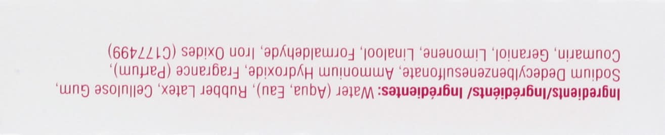 Ingredients: Water Aqua, Eau, Rubber Latex, Cellulose Gum, Sodium Dedecylbenzenesulfonate, Ammonium Hydroxide, Fragrance Parfum, Coumarin, Geraniol, Limonene, Linalool, Formaldehyde, Iron Oxides C177499.