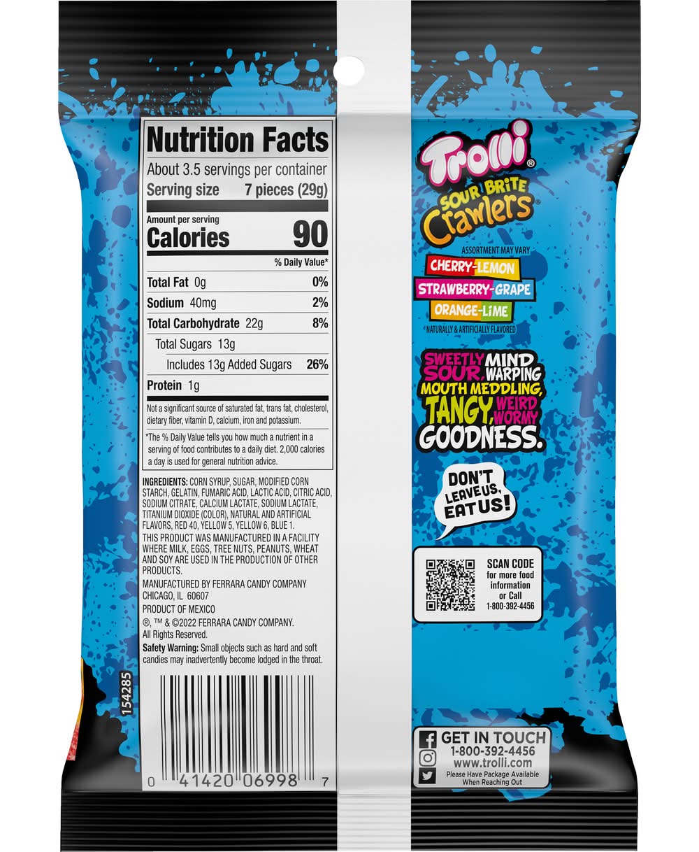 Trolli Sour Brite Crawlers Candy offers a blend of dual flavors including cherry-lemon, strawberry-grape, and orange-lime. Each serving contains 90 calories and the candies are naturally and artificially flavored. The assortment of flavors provided may vary. These candies are produced in Mexico. • Flavor: Assorted • Size: 3.4 OZ
