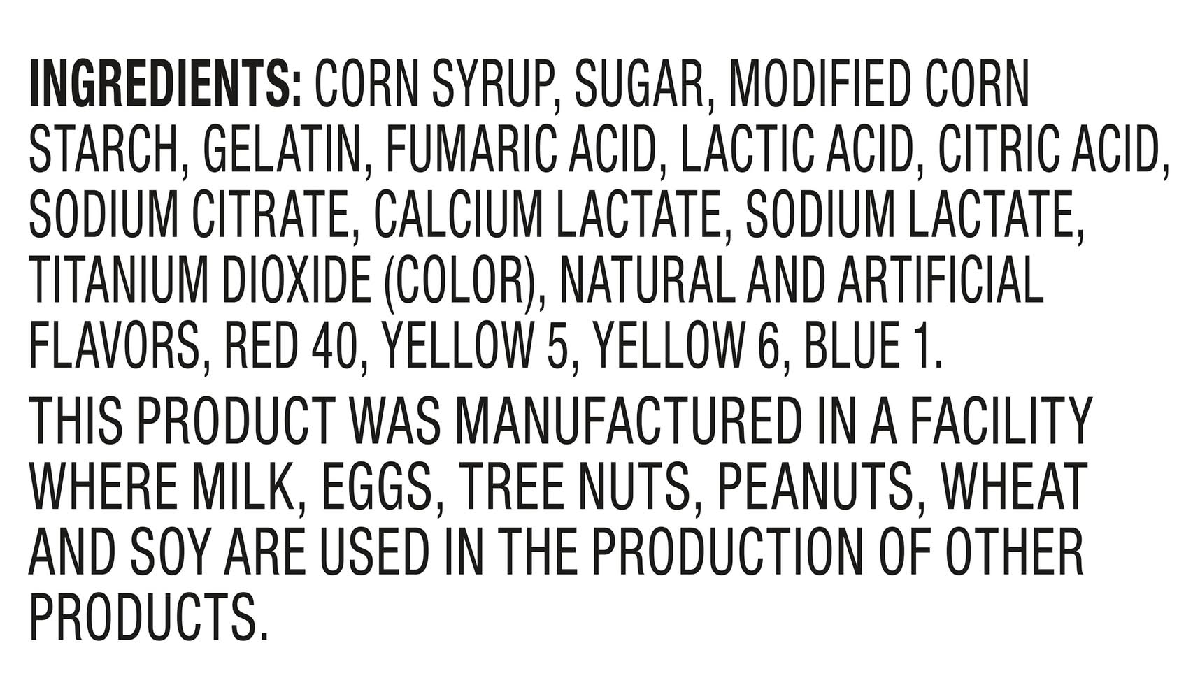 Ingredients: Corn Syrup, Sugar, Gelatin, Modified Corn Starch, Gelatin, Fumaric Acid, Lactic Acid, Citric Acid, Sodium Citrate, Calcium Lactate, Sodium Lactate, Titanium Dioxide (Color), Natural and Artificial Flavors, Red 40, Yellow 6, Blue 1. Contains: Eggs, Milk, Tree Nuts, Wheat, Peanuts, Soybeans