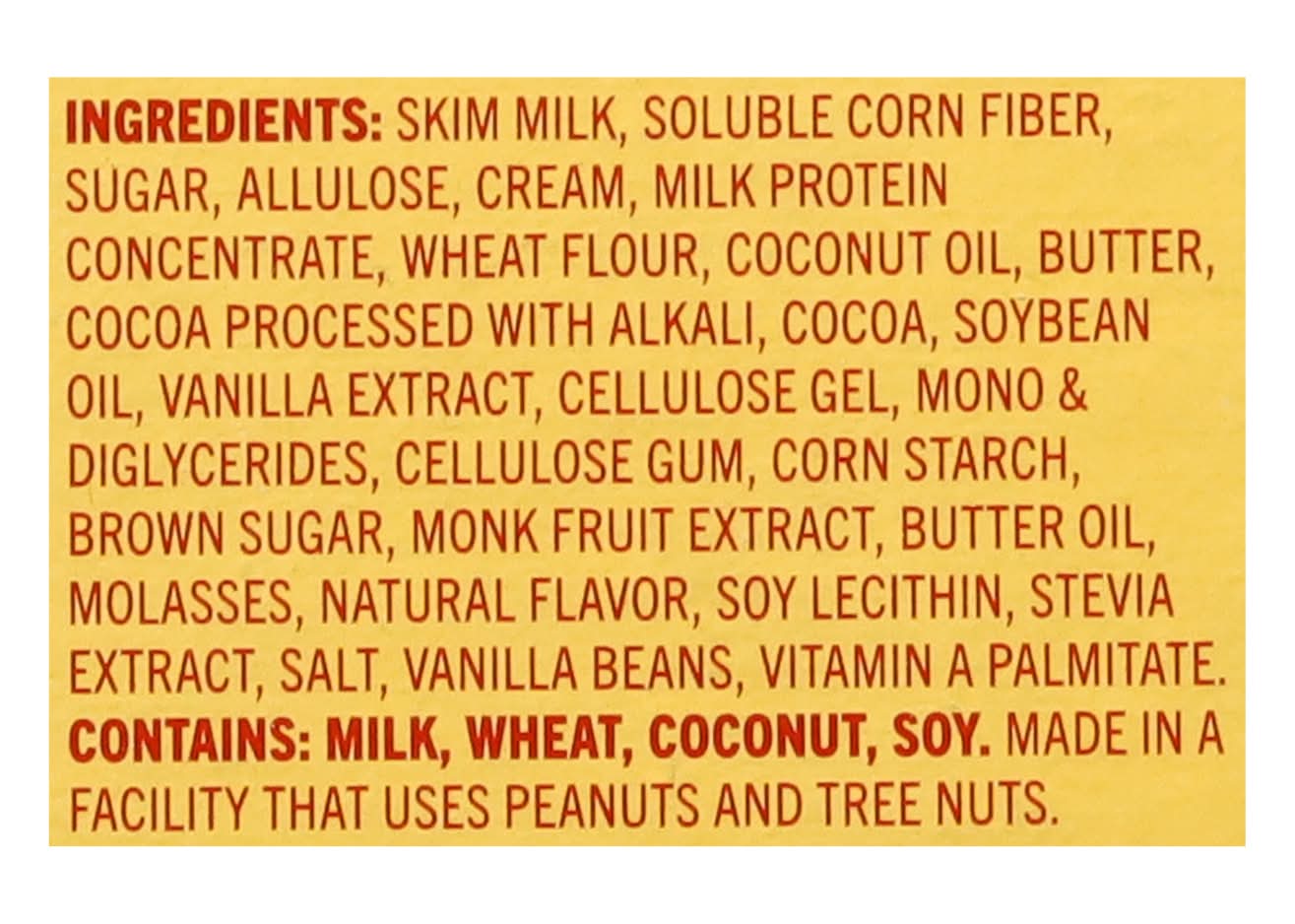 Skim Milk, Soluble Corn Fiber, Sugar, Allulose, Cream, Milk Protein Concentrate, Wheat Flour, Coconut Oil, Butter, Cocoa Processed with Alkali, Cocoa, Soybean Oil, Vanilla Extract, Cellulose Gel, Mono & Diglycerides, Cellulose Gum, Corn Starch, Brown Sugar, Monk Fruit Extract, Butter Oil, Molasses, Natural Flavor, Soy Lecithin, Stevia Extract, Salt, Vanilla Beans, Vitamin A Palmitate Contains: Milk, Wheat, Tree Nuts, Coconuts, Soybeans, Corn, Peanuts, Tree Nuts